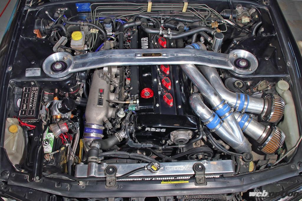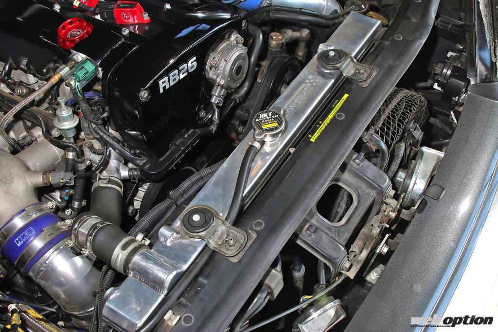 RB26DETTエンジンは、HKSの1mmオーバーサイズピストンにJUNの2.6Lフルカンタークランク&スペシャルコンロッドを組み合わせたボアアップの2.7L仕様。摺動部は全てWPCまたはDLC処理を施して、抵抗を低減している。