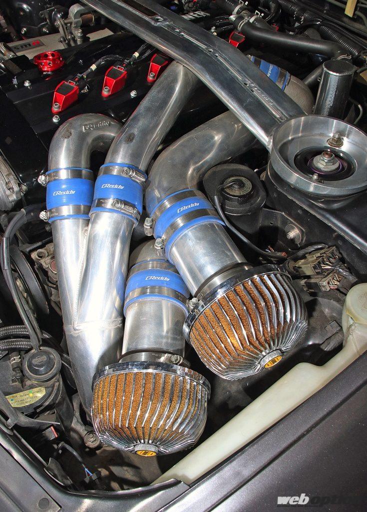 組み合わせるタービンはHKSのGT-SSツイン。最大ブースト1.3キロの設定で、最高出力580ps&最大トルク68kgmを獲得。今ならHKSのGTIII-2530タービンの組み合わせで、さらに鋭いブーストの立ち上がりレスポンスも可能だという。