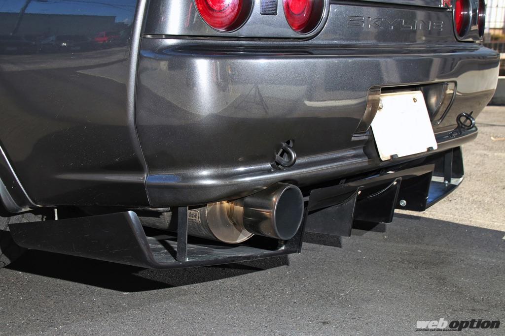 排気系はノーマルEXマニにワンオフチタンフロントパイプ、緑整備センターのマフラーという組み合わせ。純正バンパーの下に追加したアンダーディフューザーが、このマシンで唯一と言えるアフターの空力パーツだ。