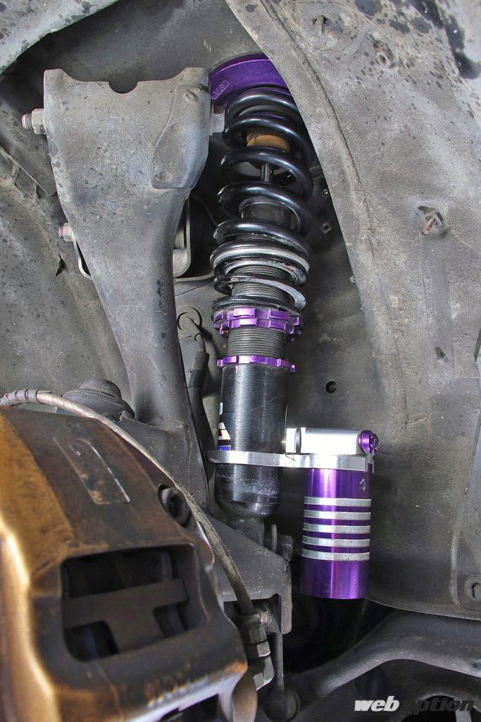 車高調は別タンク装備3ウェイ減衰力調整式のD2レーシング。ニスモ製のサスペンションアーム類とトラストアルコンのブレーキシステムも含め、オーナーがもう1台所有しているR34サーキット仕様からのお下がりなのだとか。