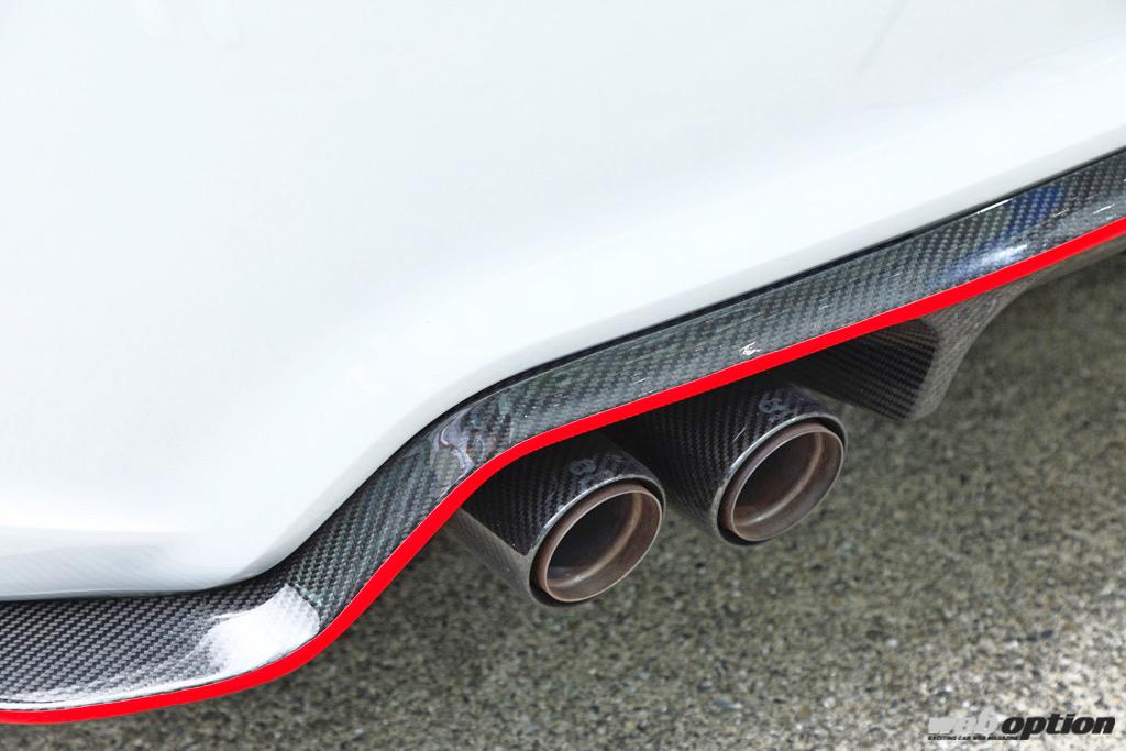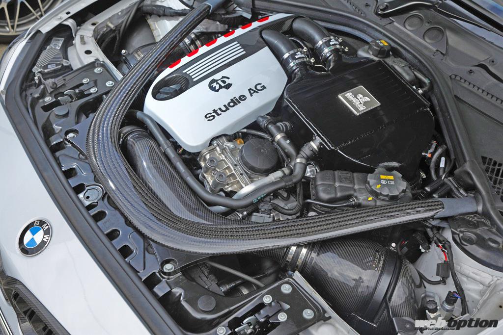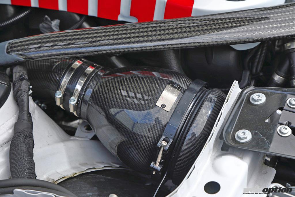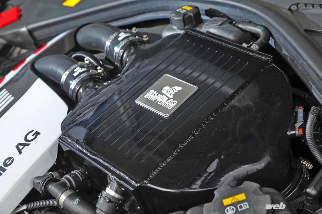 まずエンジンは、補機類の変更した上でスタディの専用サブコン“STP3”でブーストアップを敢行。これにより、純正比70psアップとなる483psを獲得している。カーボンエンジンカバーも、コンセプトカラーの一環だ。
