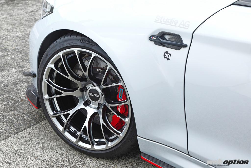 装着しているホイールはボルクレーシングG16。美しいラインで描かれた独創的メッシュデザインは、角度により異なるイメージをみせてくれるのが特徴だ。サイズはフロントが19×9J+23、リヤが19×10J+34だ。
