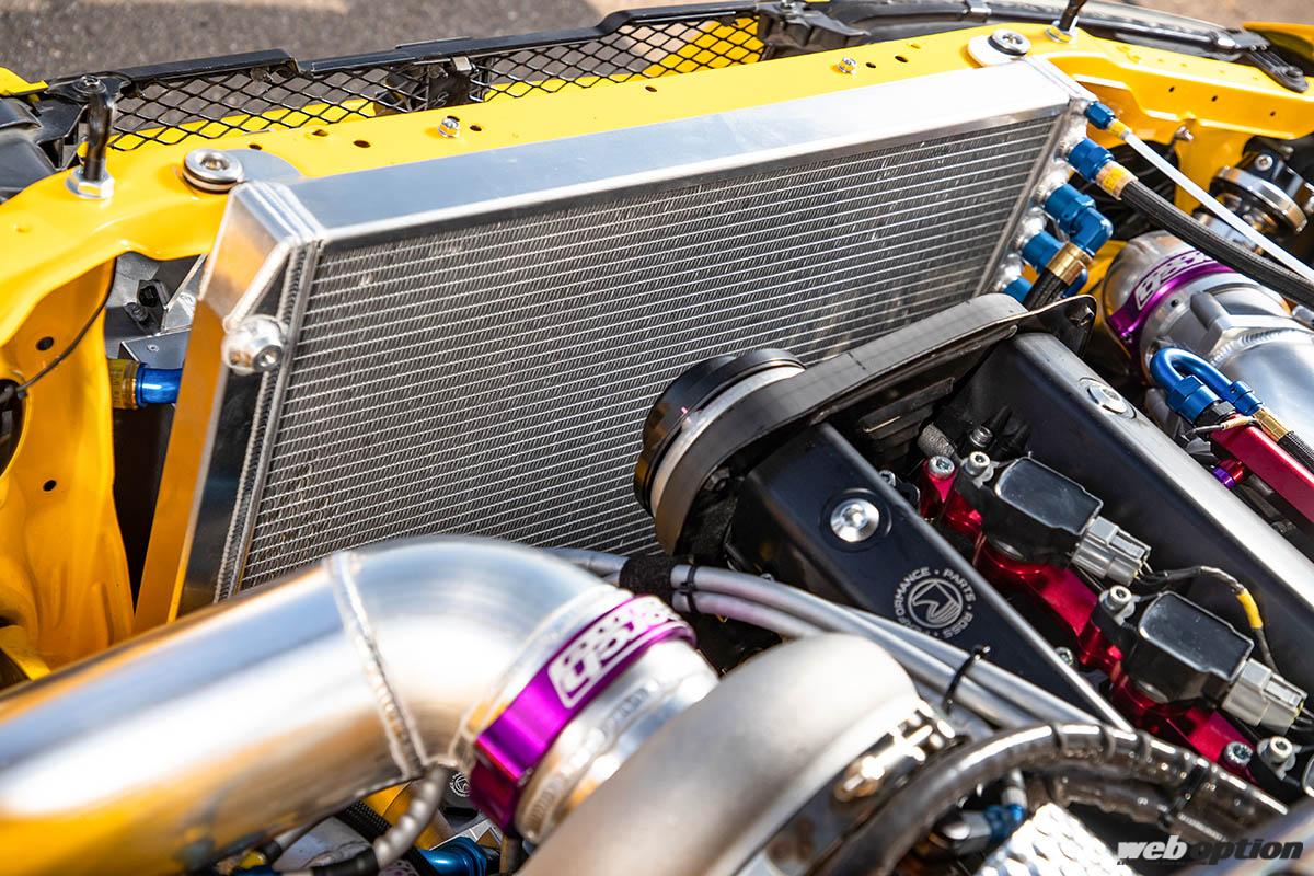 サイドタンク式のラジエターは、サージタンク同様アルミ加工を得意とするハイパーチューン社の製品。日本ではあまり聞かないが、ハイパーチューン社ではラジエターやインタークーラーなどのクーリングアイテムも多数ラインナップしている。