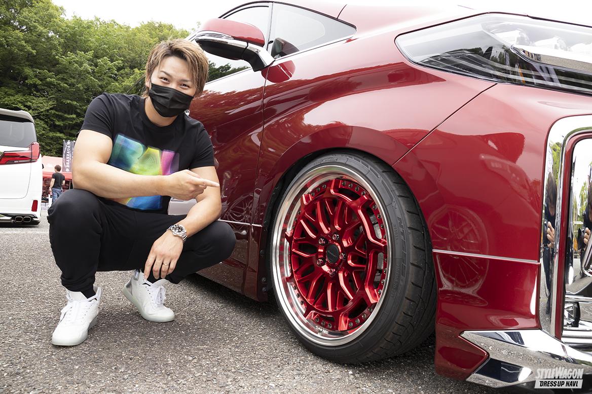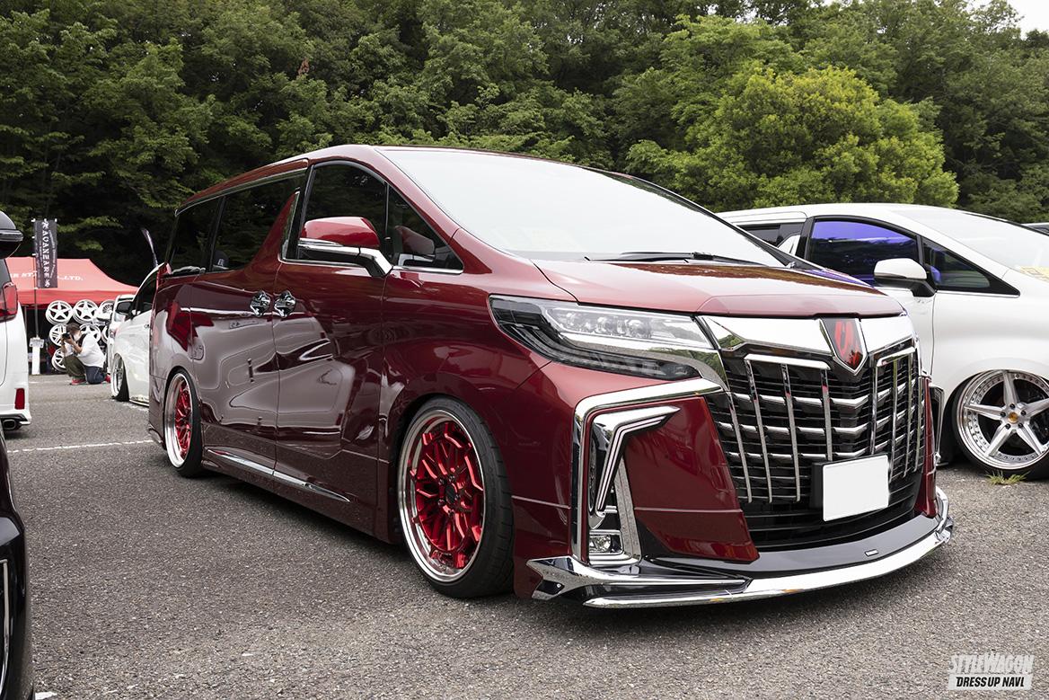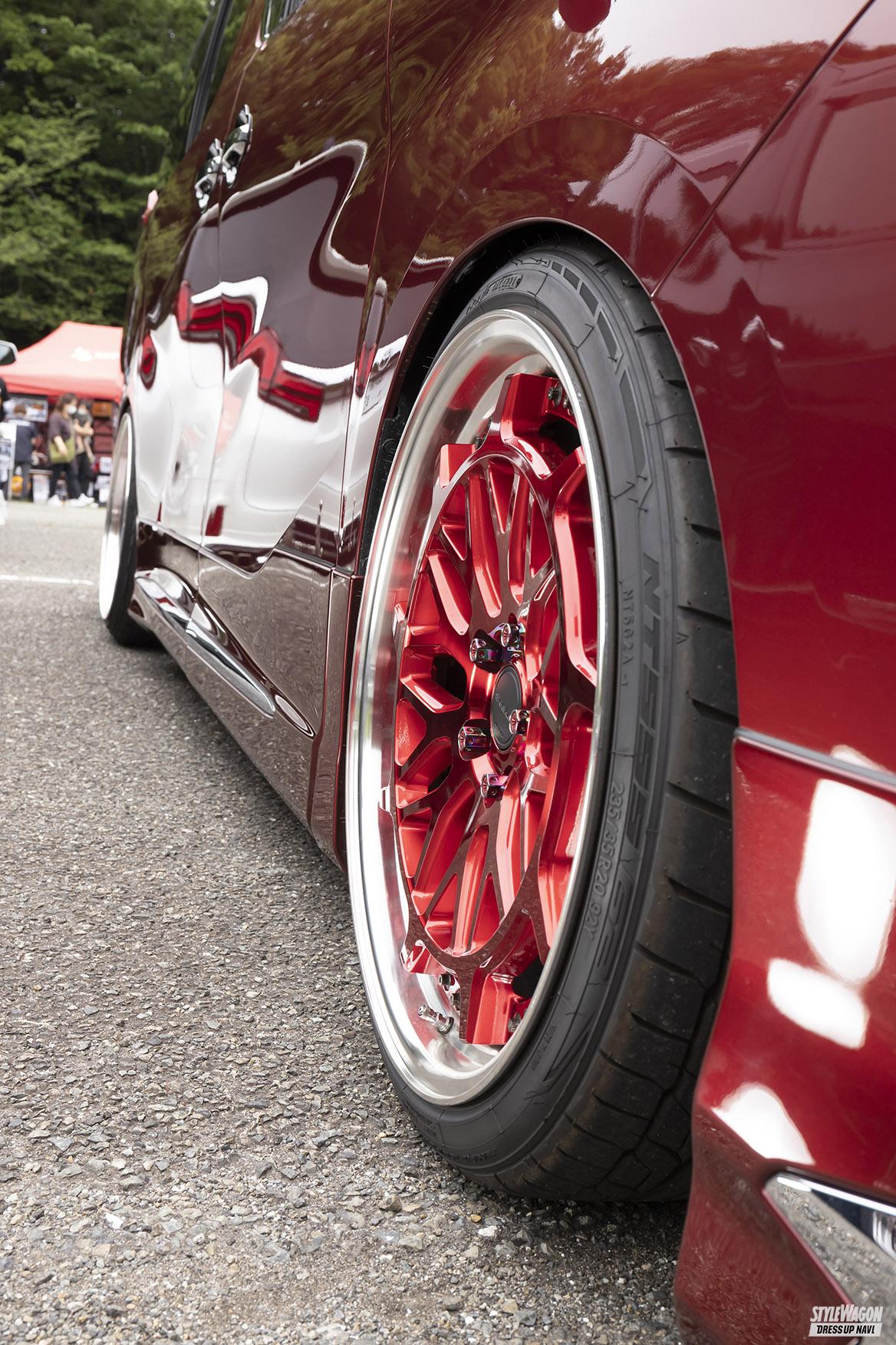 ダークレッドマイカのボディカラーに合わせて、キャンディレッドのグランシーカーDMX(20インチ)を車高調でリムツラにマッチング。フードトップモールやエンブレムもレッド系に塗装することで全身をバランス良くコーディネイト。今後は「走行時の車高やイベントでの低車高など、自由度を考えるとエアサスを入れたい」と古木さん。