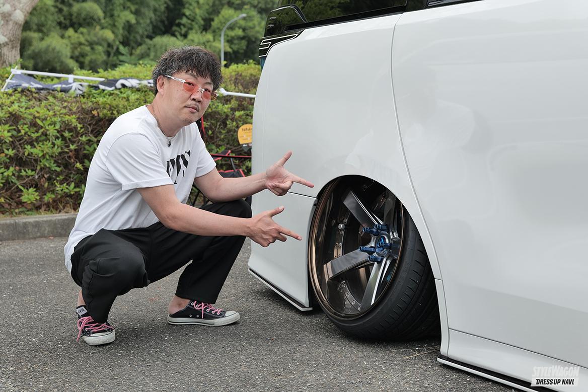 車自体をコンプリートカーで購入しようといろいろと検討するなかでリバティーウォークのコンプリートにたどり着いたという重村さん。黒で統一されたコンプリートカーはゴテゴテしていなくシンプルな感じでお気に入りだという。ホイールはリバティーウォーク×ゴーストラインの22インチ。コンプリートで購入時から装着されていたものだという。