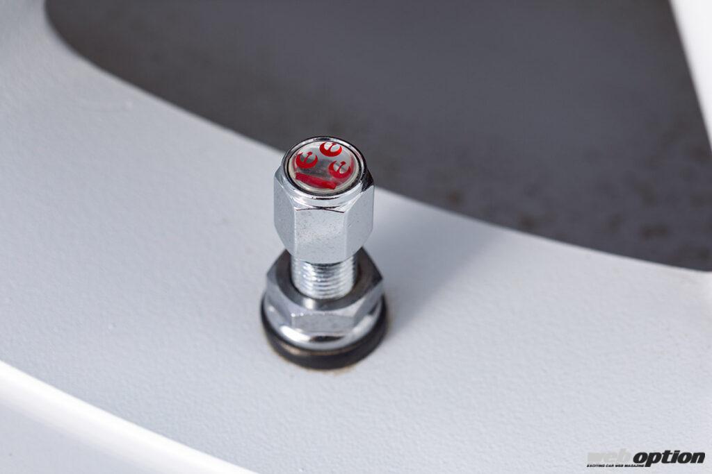付属のエアバルブキャップや別売りのセンターキャップのデザインは、渡辺家の家紋をアレンジした社紋。3羽の鶴は会社の所在地である横浜市鶴見区を表したものなのだ。