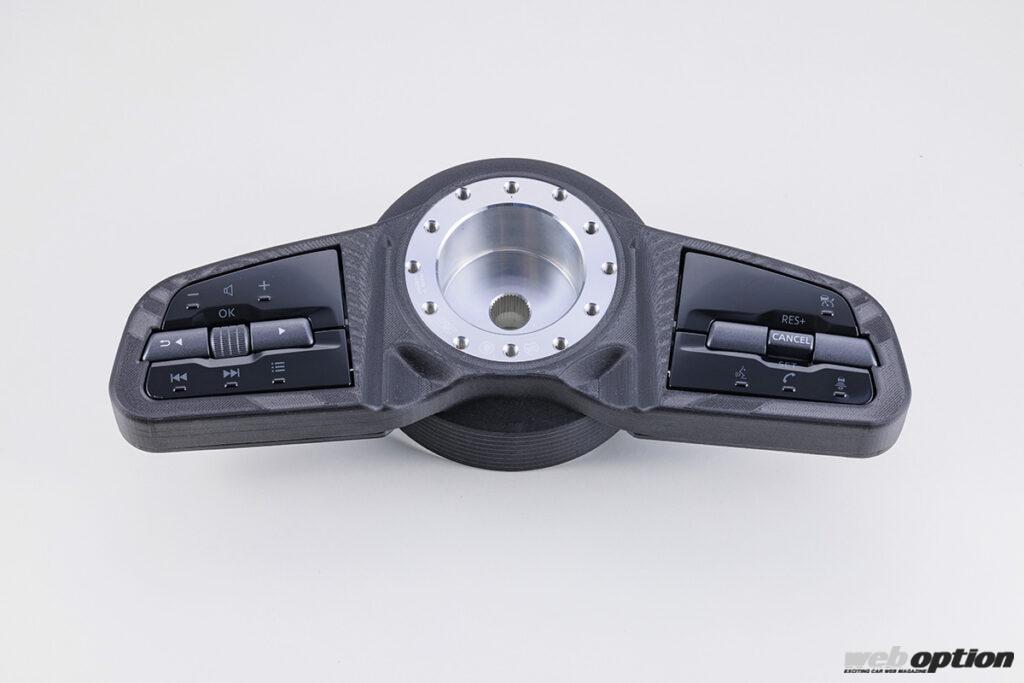 純正ステアリングから取り外したスイッチユニットをステアリングとボスの間に噛ませたステーに取り付けることで、社外ステアリングでも純正スイッチが活かせるようになるこのアイテム。素材にはマイクロカーボン強化ナイロン素材を採用し、十分な強度と高い質感を実現しているのも見どころ。