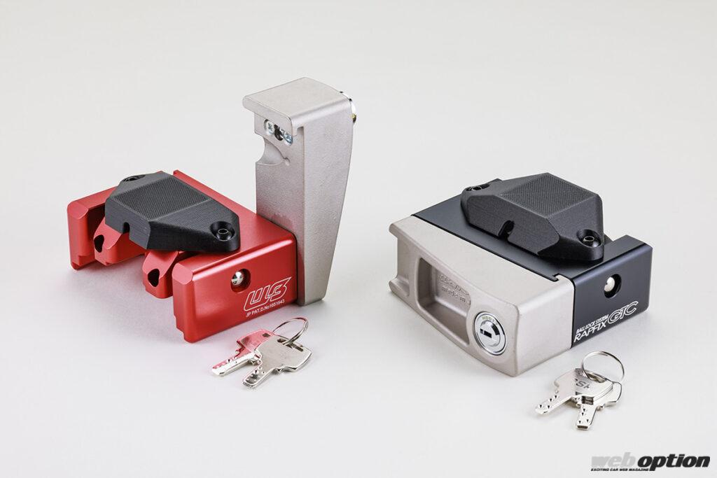 ラフィックスGTCのチルト機構を完全にロックするための「ラフィックスGTCキーロックシステム(4万2680円)」も見逃せない。跳ね上げられたステアリングは、このロックユニットを取り外さないかぎり下ろせないため、盗難防止効果は絶大だ。カラーはレッドとブラックの2色展開となる。