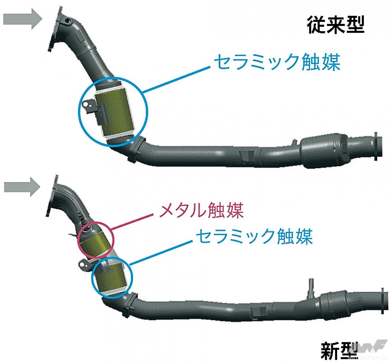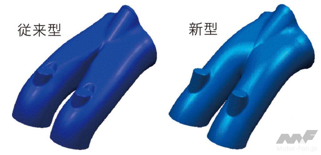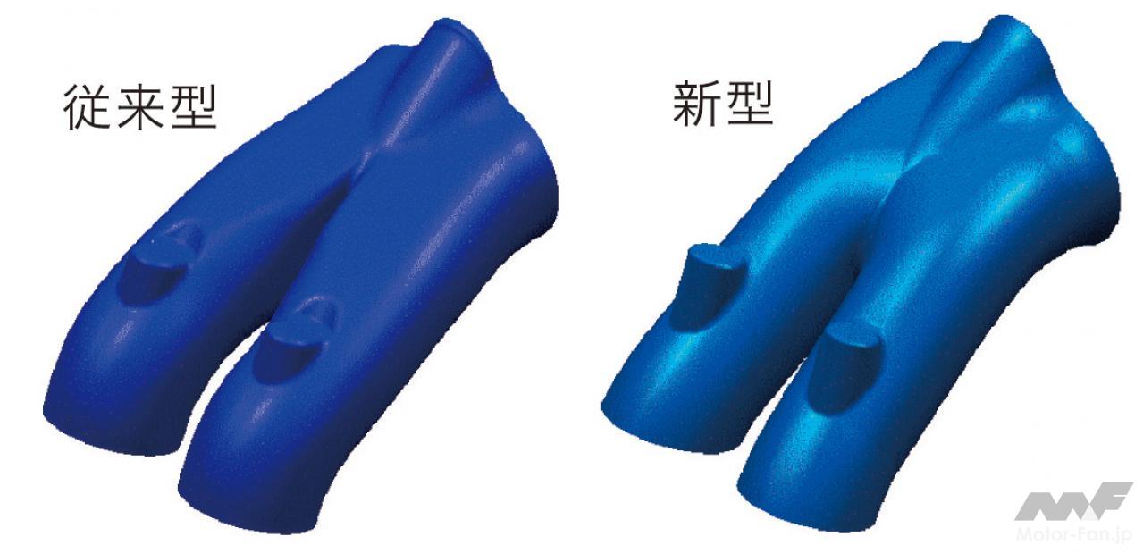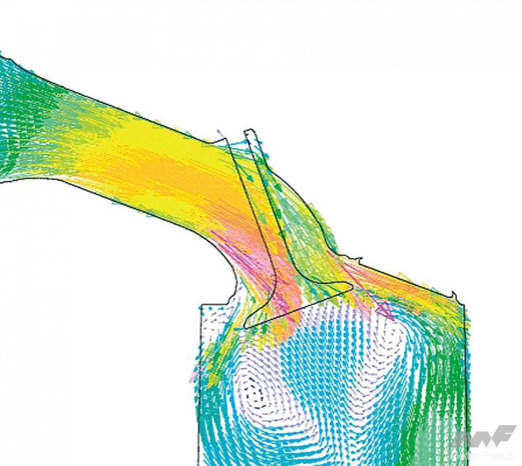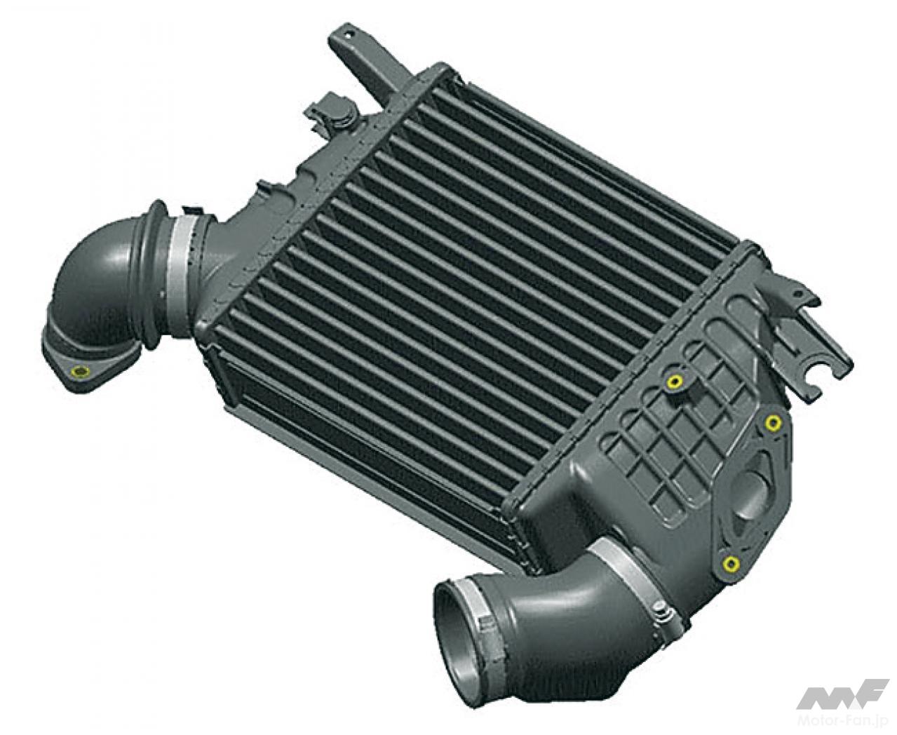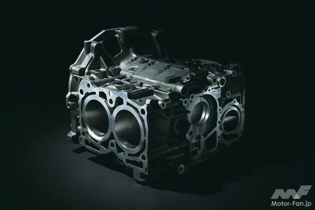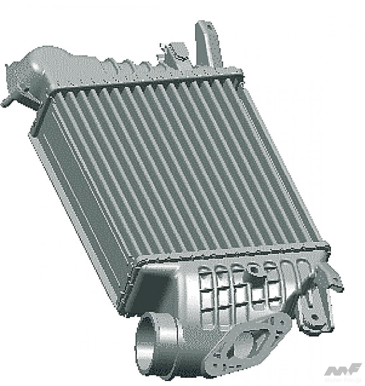 自動車ニュース テクノロジー スバル スバルEJ20:WRX、インプレッサ、フォレスターに採用された要素技術[内燃機関超基礎講座] 2022.08.19 11:39 by Motor Fan illustrated編集部 この記事の画像をもっと見る(全17枚) EJ20はデビュー以来、数え切れないほどの改良を受けて、第一線のエンジンであり続けた。では、2008年当時の車種においてはどのような技術が投入されていたのか。 TEXT:近田茂(CHIKATA Shigeru) *本記事は2008年5月に執筆したものです 連載内燃機関超基礎講座 INDEXインプレッサ WRX STI(CBA-GRB)インプレッサ(3代目)フォレスター(3代目) インプレッサ WRX STI(CBA-GRB) エンジンブロック:セミクローズドデッキを採用したエンジンブロック。強力なターボパワーはもちろんのこと、競技用へのチューニングアップをも考慮しているのが特徴である。耐久信頼性に対してまだ余力を残す頑強な設計が施されているわけだ。 吸気ポート:よりスムーズな吸気通路を追求して新設計された吸気ポート。内径と管長を最適化し、吸気効率を向上させている。電子スロットルの採用と相まって、ドライバーの操作に対するレスポンスとリニアリティが高められた。ターボによる過給が行なわれない低回転領域においてもトルクアップが図られ、低速域からの立ち上がり加速に優れ、扱いやすいエンジンに仕上げられた。 排気ポート:左右対称に設置されているエキゾーストポートも、排気がよりスムーズに流れるように新設計されている。気筒あたりふたつの排気ポートから1本に集合するまでに描くポート形状は、旧型のものより角のとれたデザインを採用している。ポート集合部までの距離も長く設定され、排気の流れを邪魔しない配慮が見て取れるものだ。 コンプレッサー断面形状の最適化:排気を整流することで、ターボの過給効率を高めるツインスクロール式タービンを採用。ハウジングの形状を最適化した新デザインとなった。ハウジング内に発生する空気の2次流を抑えることで、過給効率はより高くなったという。デュアルAVCSなどと相まって、低速域から高回転までフィーリングに優れた出力特性を発揮する。 触媒レイアウト:ツインスクロールタービンの直後には、メタル触媒とセラミック触媒を連続して直列配置するタンデムレイアウトを採用。メタル触媒をエンジン近くに設置したのは、熱伝達特性に優れるメタル触媒を使うことで、早期活性化によりその効果を促進し、エンジン始動直後のエミッションを低減する狙いがあるわけだ。 横置きマフラーの採用:プロペラシャフトの下を右から左にクロスしながら後方へ導かれるエキゾーストパイプは、ツインデュアルテールパイプの大容量マフラーにつながっている。マフラーはカーゴフロアの下に横置きレイアウトされ、デュアルパイプは綺麗に磨き上げられたステンレス製75mm径×4本が採用されている。 インプレッサ(3代目) デュアルAVCS:ターボエンジンにはAVCSがデュアルで装備された。吸気側、排気側共にバルブの開閉タイミングを自動的に連続可変制御するものである。シリンダーヘッドが左右に分かれるボクサーエンジン故、油圧による同制御ユニットは全部で4個を備えている。これにより低回転域からスムーズに高トルクを発生し、レスポンスの良い走りを生む。 電子制御スロットル:電子制御スロットルの採用が新しいポイントである。ドライバーのスロットル操作に対して、エンジンの回転を始め、必要とされるパワーの度合いなど、様々な要件から計算される最適の燃料供給をコントロールし、優れたドライバビリティの発揮に貢献する。新型ポートで吸気効率も向上し、低速域のトルクアップも達成した。 空冷式インタークーラー:空冷式のインタークーラーに変わりは無いが、スクエアに近い新型デザインに変更されている。取り付け位置は基本的に大差ないが、車体への取り付け角度やエアインテークからの流入空気量の最適化を図ることで、冷却効率を向上し、ターボを通過した新気の充填効率をより高いものにしている。 等長等爆エキゾーストシステム:専用新開発された等長等爆エキゾーストシステムは、前側2気筒と後側2気筒を集合させることで、気筒間の排気干渉を軽減する。排気ポートからターボユニットまでの排気効率を高め、幅広い回転域で過給効果を得て、トルクとレスポンスを向上している。触媒はふたつのユニットが縦に並んで設置されている。 横置きマフラー:S-GTグレードに装着されるマフラーは、やはりカーゴフロア下部に横置きレイアウトされる33ℓ大容量マフラーだ。静粛性と排気効率の確保を両立するための必然策である。EL15エンジンのマフラーが17ℓ容量であることを考えると、EJ20のターボエンジンは、いかに高出力を誇っているかがここからも理解できるだろう。 フォレスター(3代目) 新設計DOHCシリンダーヘッド冷却水経路の最適化:高性能の追求において、発熱および冷却との戦いは欠かせない。この図は、新開発されたシリンダーヘッド部
