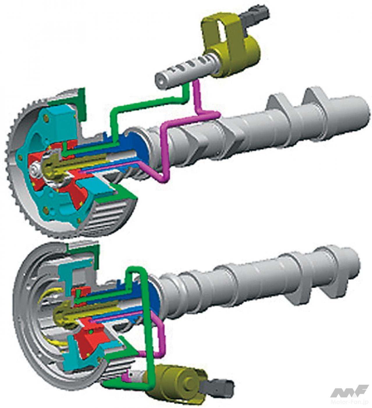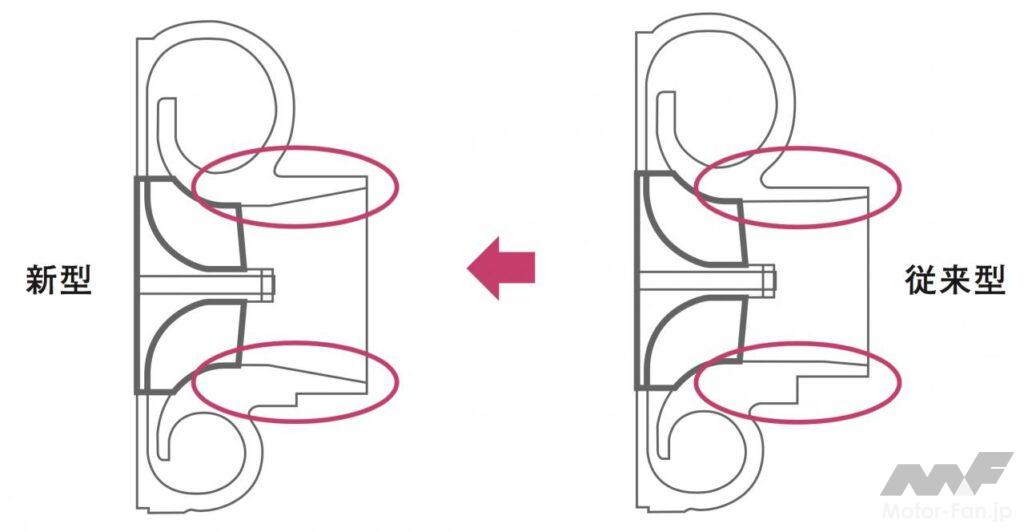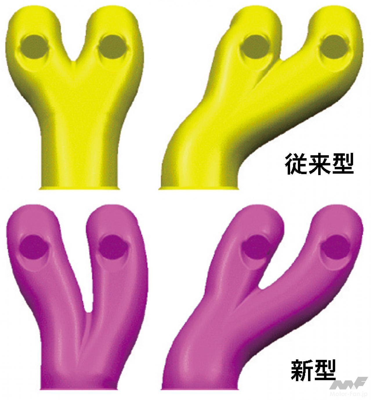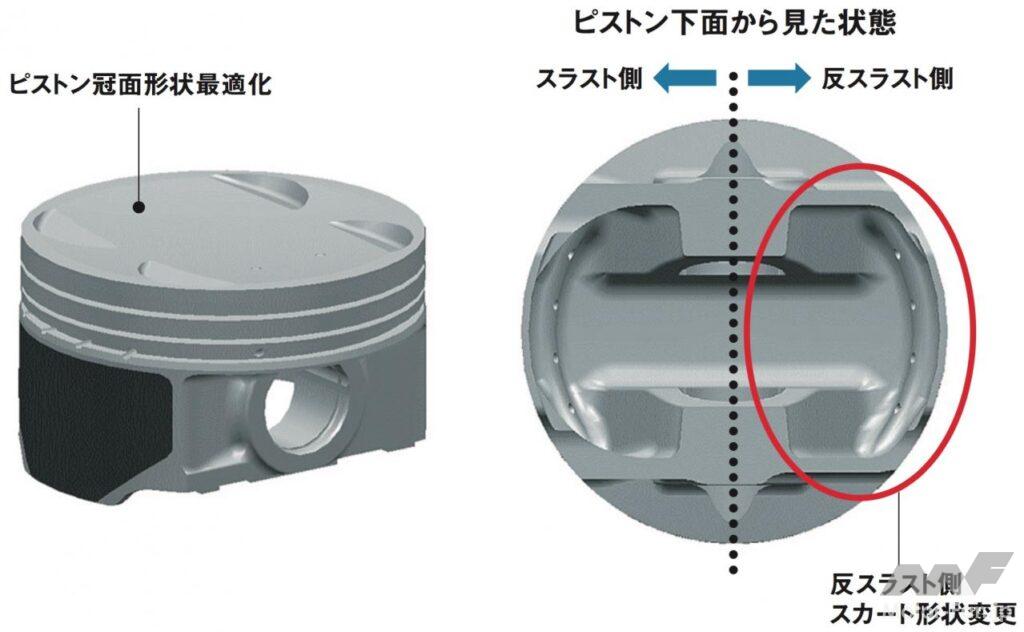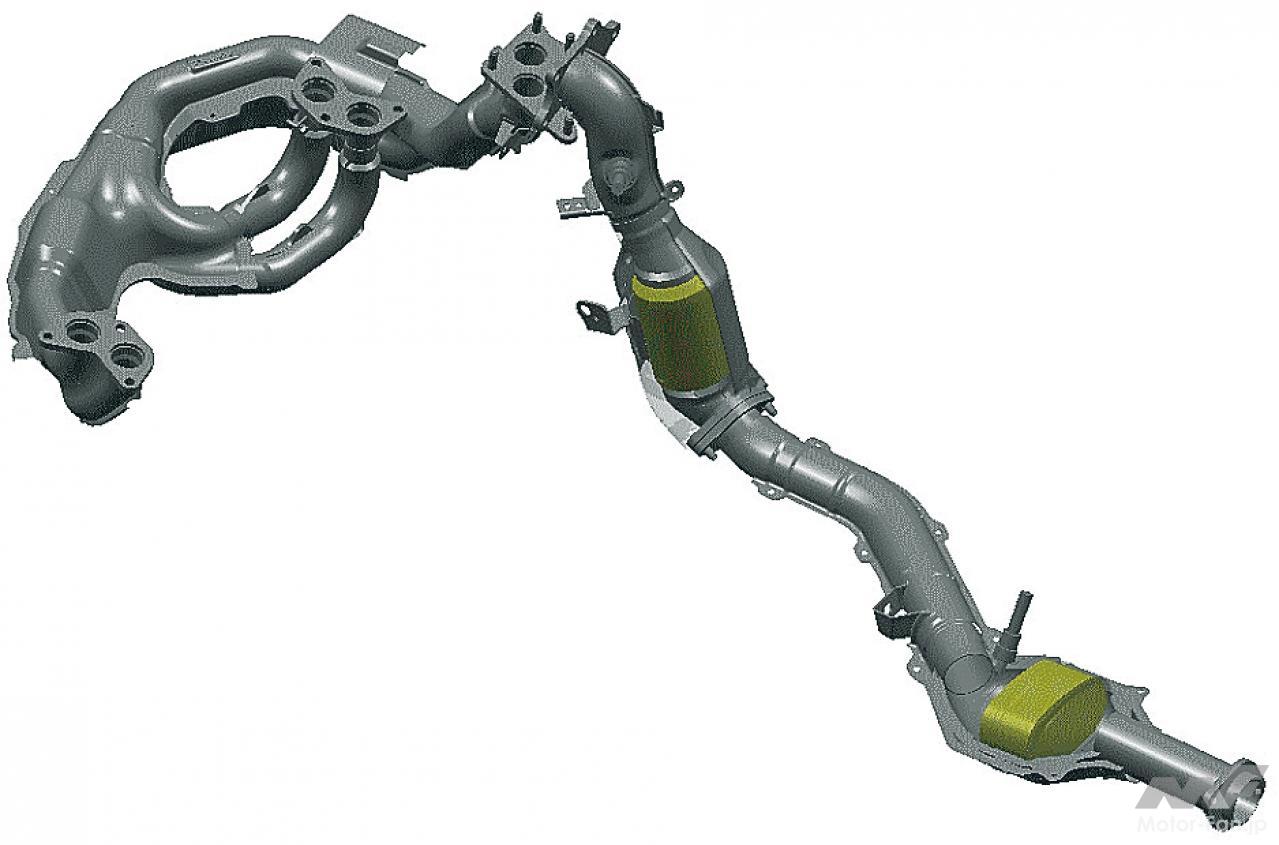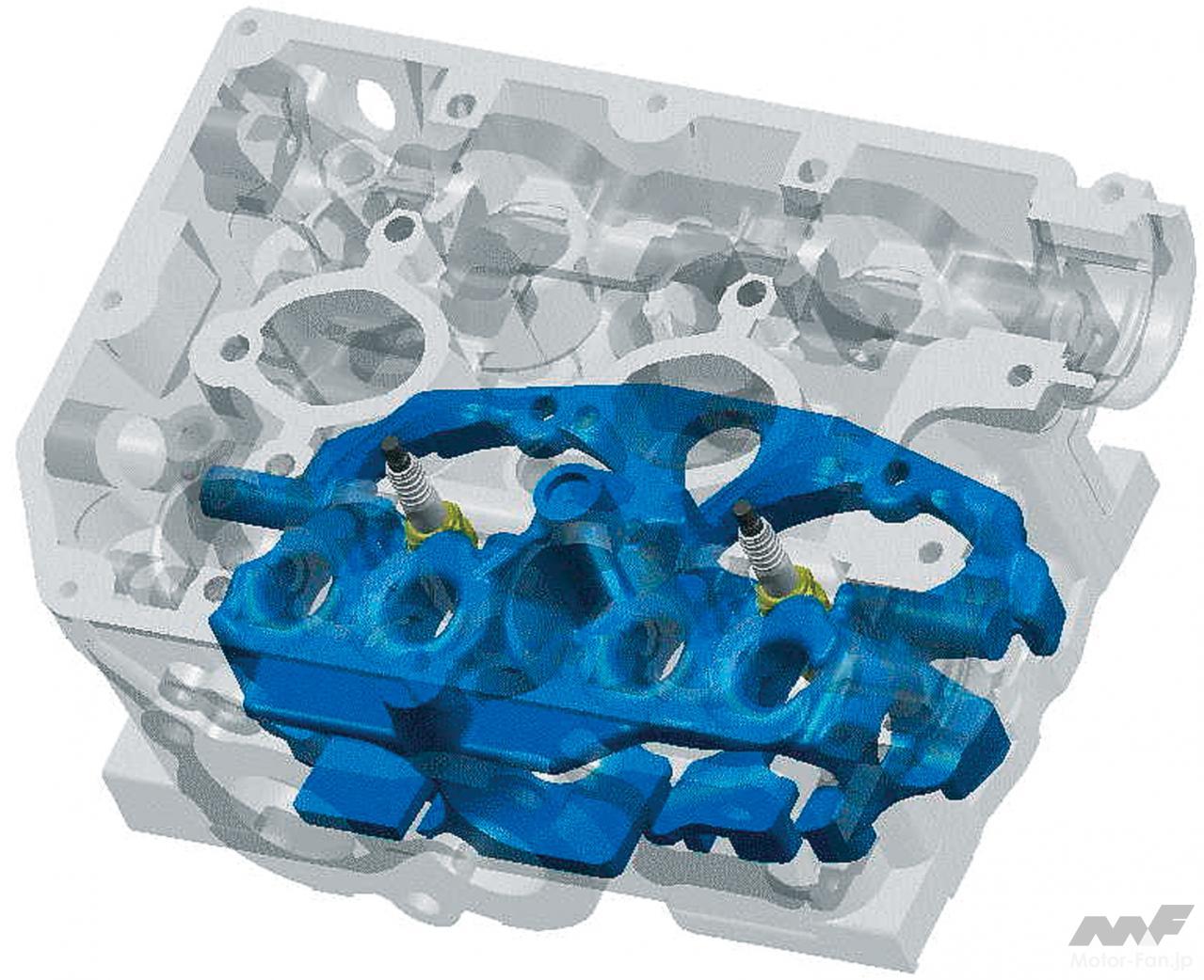 自動車ニュース テクノロジー スバル スバルEJ20:WRX、インプレッサ、フォレスターに採用された要素技術[内燃機関超基礎講座] 2022.08.19 11:39 by Motor Fan illustrated編集部 この記事の画像をもっと見る(全17枚) EJ20はデビュー以来、数え切れないほどの改良を受けて、第一線のエンジンであり続けた。では、2008年当時の車種においてはどのような技術が投入されていたのか。 TEXT:近田茂(CHIKATA Shigeru) *本記事は2008年5月に執筆したものです 連載内燃機関超基礎講座 INDEXインプレッサ WRX STI(CBA-GRB)インプレッサ(3代目)フォレスター(3代目) インプレッサ WRX STI(CBA-GRB) エンジンブロック:セミクローズドデッキを採用したエンジンブロック。強力なターボパワーはもちろんのこと、競技用へのチューニングアップをも考慮しているのが特徴である。耐久信頼性に対してまだ余力を残す頑強な設計が施されているわけだ。 吸気ポート:よりスムーズな吸気通路を追求して新設計された吸気ポート。内径と管長を最適化し、吸気効率を向上させている。電子スロットルの採用と相まって、ドライバーの操作に対するレスポンスとリニアリティが高められた。ターボによる過給が行なわれない低回転領域においてもトルクアップが図られ、低速域からの立ち上がり加速に優れ、扱いやすいエンジンに仕上げられた。 排気ポート:左右対称に設置されているエキゾーストポートも、排気がよりスムーズに流れるように新設計されている。気筒あたりふたつの排気ポートから1本に集合するまでに描くポート形状は、旧型のものより角のとれたデザインを採用している。ポート集合部までの距離も長く設定され、排気の流れを邪魔しない配慮が見て取れるものだ。 コンプレッサー断面形状の最適化:排気を整流することで、ターボの過給効率を高めるツインスクロール式タービンを採用。ハウジングの形状を最適化した新デザインとなった。ハウジング内に発生する空気の2次流を抑えることで、過給効率はより高くなったという。デュアルAVCSなどと相まって、低速域から高回転までフィーリングに優れた出力特性を発揮する。 触媒レイアウト:ツインスクロールタービンの直後には、メタル触媒とセラミック触媒を連続して直列配置するタンデムレイアウトを採用。メタル触媒をエンジン近くに設置したのは、熱伝達特性に優れるメタル触媒を使うことで、早期活性化によりその効果を促進し、エンジン始動直後のエミッションを低減する狙いがあるわけだ。 横置きマフラーの採用:プロペラシャフトの下を右から左にクロスしながら後方へ導かれるエキゾーストパイプは、ツインデュアルテールパイプの大容量マフラーにつながっている。マフラーはカーゴフロアの下に横置きレイアウトされ、デュアルパイプは綺麗に磨き上げられたステンレス製75mm径×4本が採用されている。 インプレッサ(3代目) デュアルAVCS:ターボエンジンにはAVCSがデュアルで装備された。吸気側、排気側共にバルブの開閉タイミングを自動的に連続可変制御するものである。シリンダーヘッドが左右に分かれるボクサーエンジン故、油圧による同制御ユニットは全部で4個を備えている。これにより低回転域からスムーズに高トルクを発生し、レスポンスの良い走りを生む。 電子制御スロットル:電子制御スロットルの採用が新しいポイントである。ドライバーのスロットル操作に対して、エンジンの回転を始め、必要とされるパワーの度合いなど、様々な要件から計算される最適の燃料供給をコントロールし、優れたドライバビリティの発揮に貢献する。新型ポートで吸気効率も向上し、低速域のトルクアップも達成した。 空冷式インタークーラー:空冷式のインタークーラーに変わりは無いが、スクエアに近い新型デザインに変更されている。取り付け位置は基本的に大差ないが、車体への取り付け角度やエアインテークからの流入空気量の最適化を図ることで、冷却効率を向上し、ターボを通過した新気の充填効率をより高いものにしている。 等長等爆エキゾーストシステム:専用新開発された等長等爆エキゾーストシステムは、前側2気筒と後側2気筒を集合させることで、気筒間の排気干渉を軽減する。排気ポートからターボユニットまでの排気効率を高め、幅広い回転域で過給効果を得て、トルクとレスポンスを向上している。触媒はふたつのユニットが縦に並んで設置されている。 横置きマフラー:S-GTグレードに装着されるマフラーは、やはりカーゴフロア下部に横置きレイアウトされる33ℓ大容量マフラーだ。静粛性と排気効率の確保を両立するための必然策である。EL15エンジンのマフラーが17ℓ容量であることを考えると、EJ20のターボエンジンは、いかに高出力を誇っているかがここからも理解できるだろう。 フォレスター(3代目) 新設計DOHCシリンダーヘッド冷却水経路の最適化:高性能の追求において、発熱および冷却との戦いは欠かせない。この図は、新開発されたシリンダーヘッド部