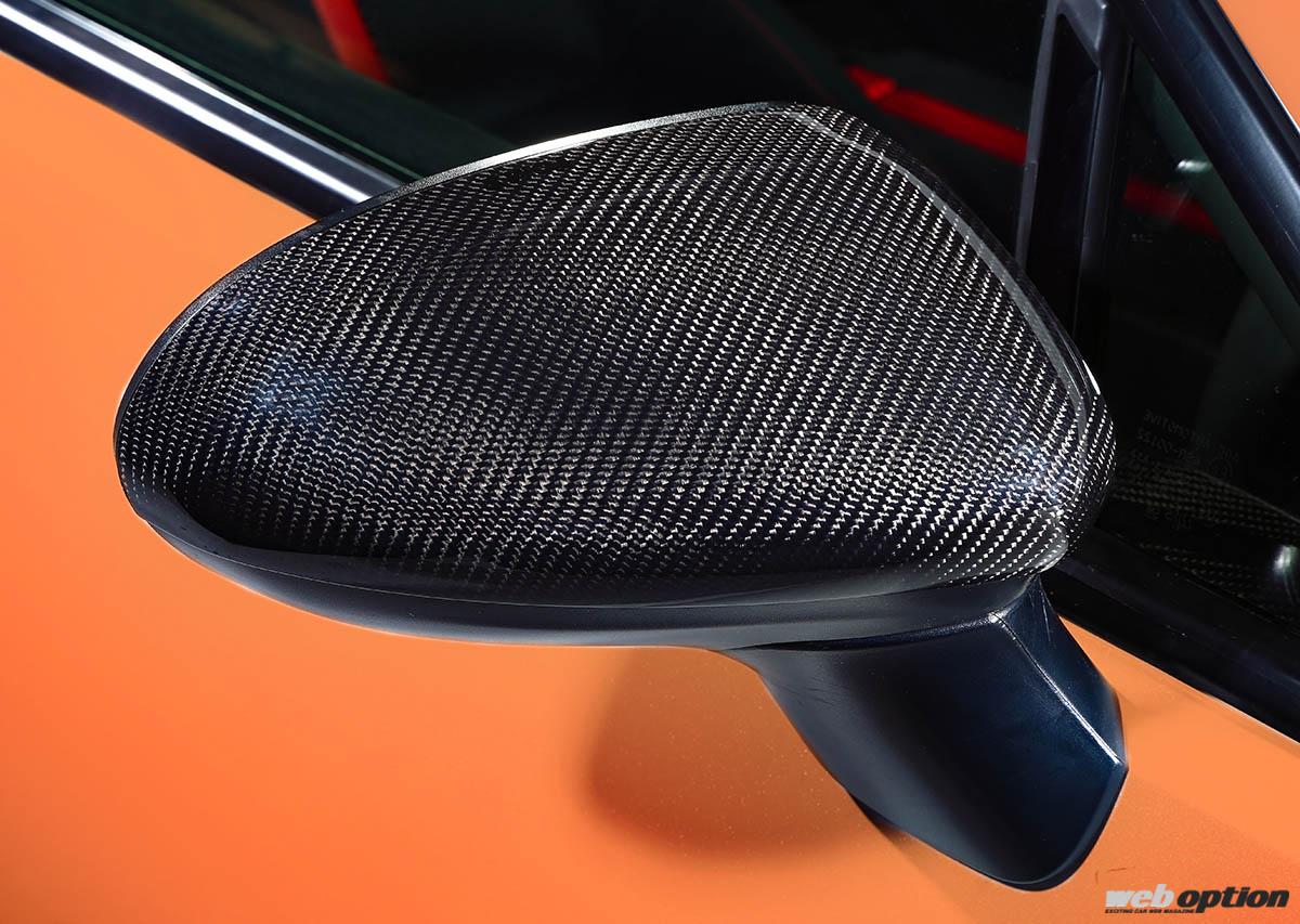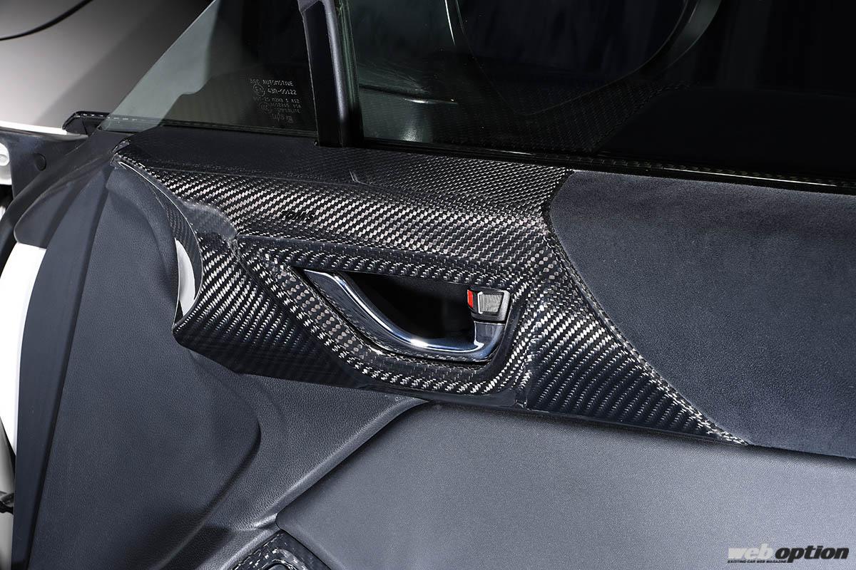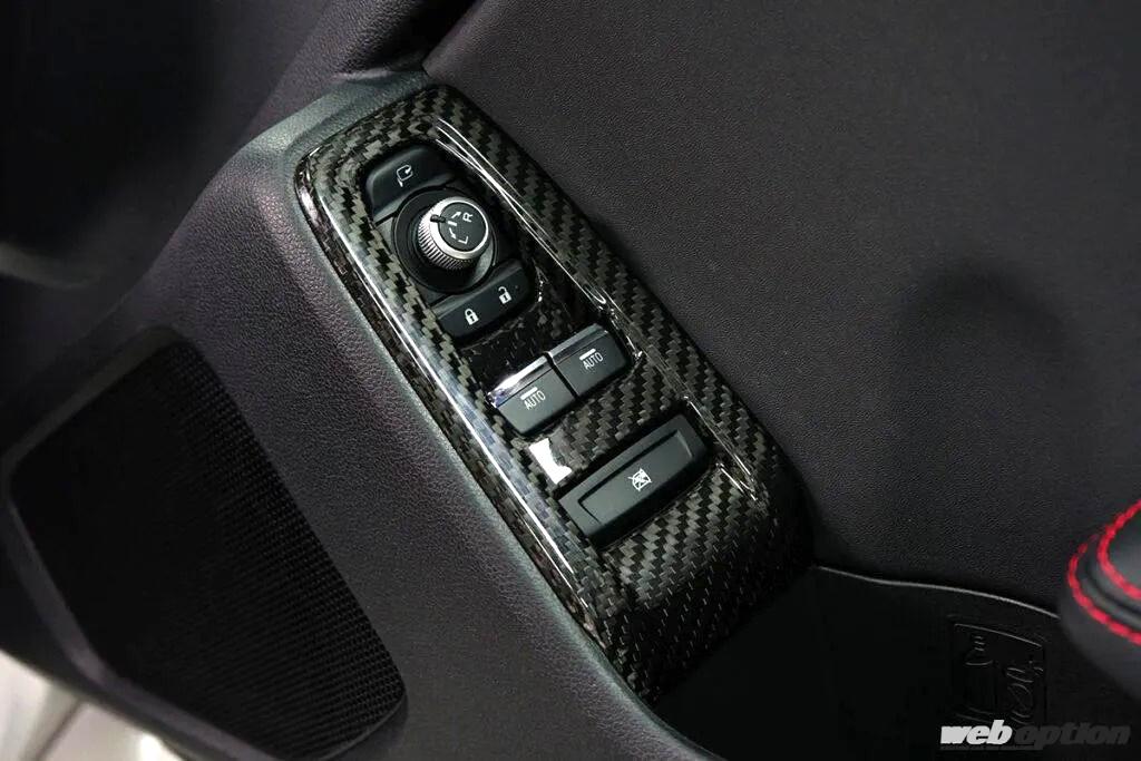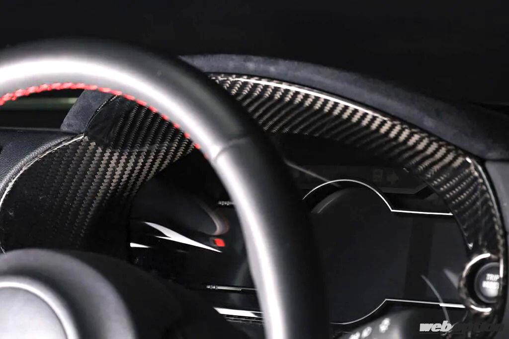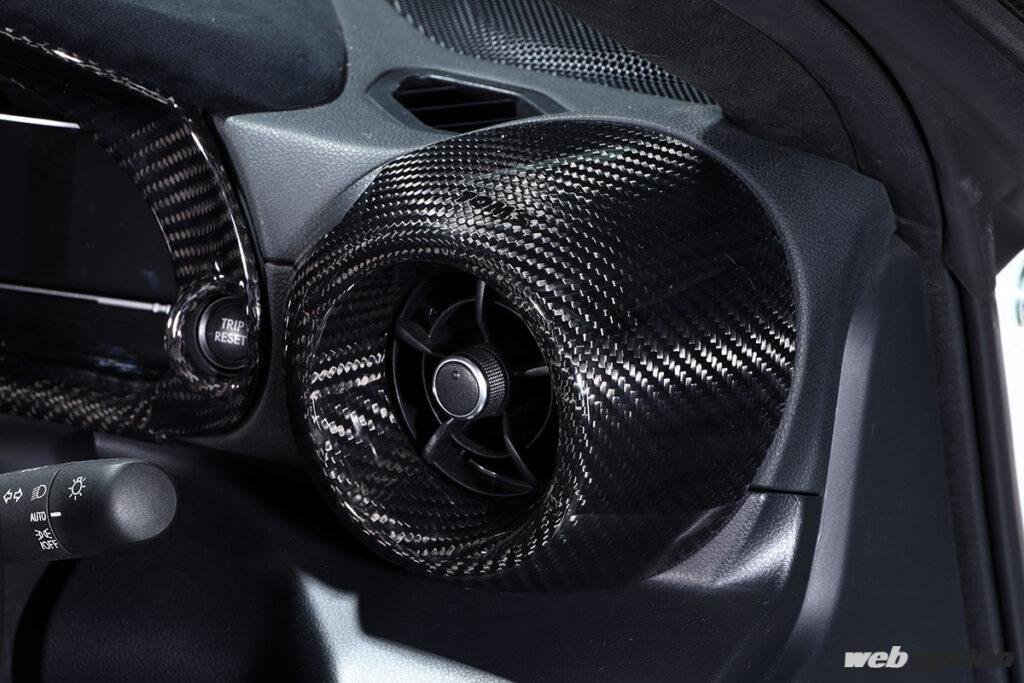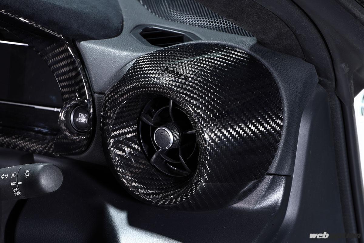 新たにラインナップされたインテリアのカーボンドレスアップパーツもその流れの一つとなる。フロントエアコンダクトカバー、サイドエアコンダクトカバー、ドアトリムカバー、シフトパネルカバー、ドアスイッチパネルカバー、メーターインナーフードカバー、スカッフカバーを設定。