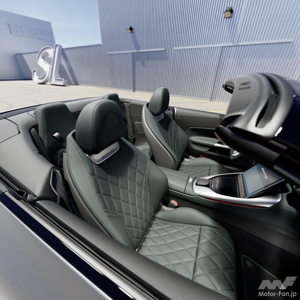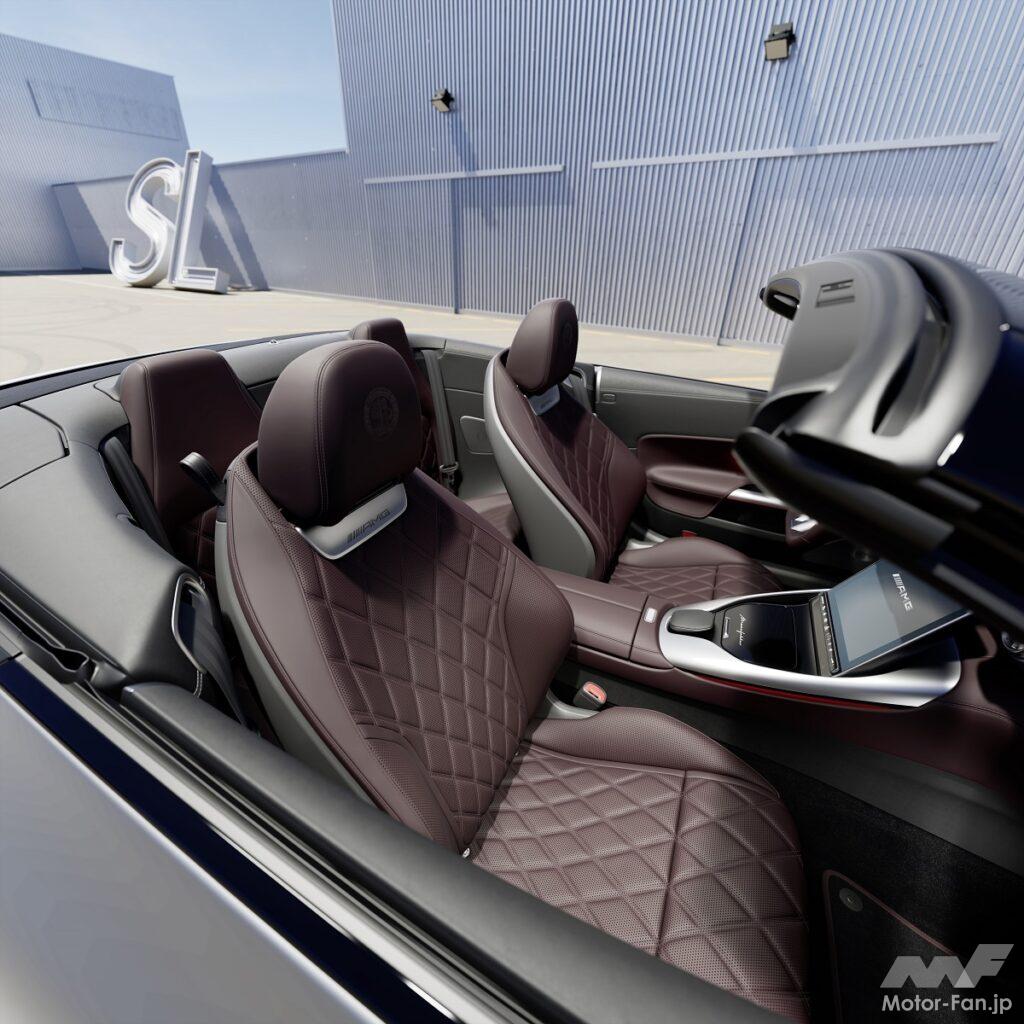 インテリアパッケージには、マニュファクチャー・エクスクルーシブ・ナッパレザーのシートが含まれており、精巧なダイヤモンドキルティングが施されている。AMGエンブレムはフロントヘッドレストにエンボス加工されている。また、ドアのアームレストとセンターパネル、センターコンソール(センターアームレスト付)、ダッシュボード下部にもマニュファクチャーカラーのナッパレザーが使用されている。インテリア・パッケージのもう一つのハイライトは、選択した内装色と同じナッパレザーのハンドステッチ入りAMGパフォーマンスマニュファクチャー・ステアリングホイールの裏地だ。ブラックのフロアマットには、AMGロゴの刺繍とナッパレザーのパイピングが施され、特にマニュファクチャーモデルのインテリアカラーは上質な仕上がりとなっている。