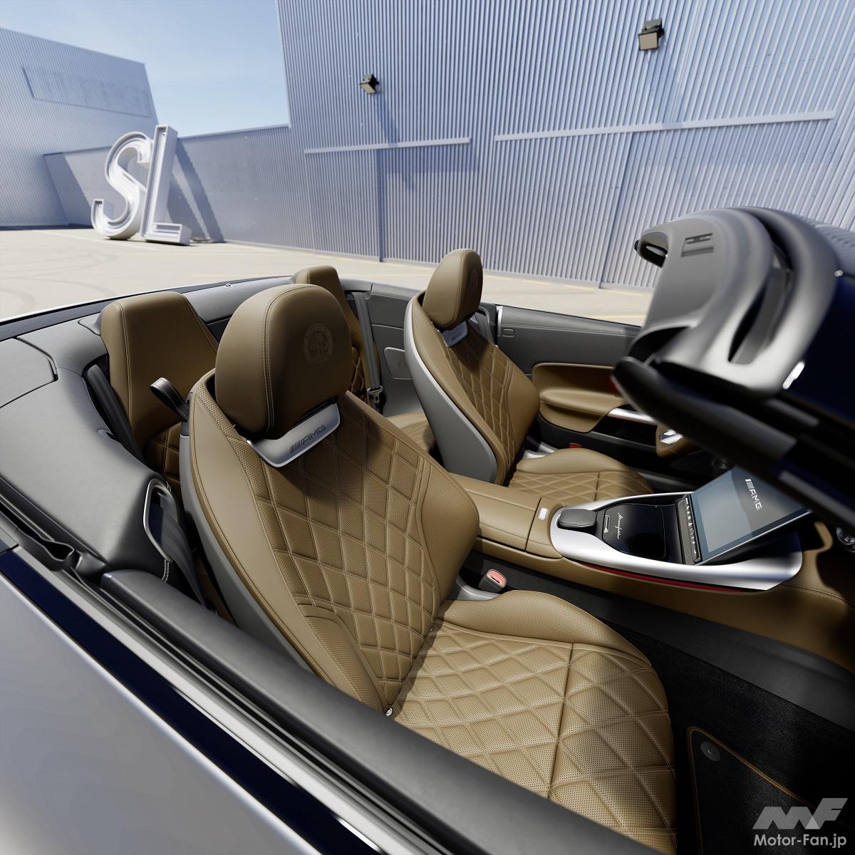 インテリアパッケージには、マニュファクチャー・エクスクルーシブ・ナッパレザーのシートが含まれており、精巧なダイヤモンドキルティングが施されている。AMGエンブレムはフロントヘッドレストにエンボス加工されている。また、ドアのアームレストとセンターパネル、センターコンソール(センターアームレスト付)、ダッシュボード下部にもマニュファクチャーカラーのナッパレザーが使用されている。インテリア・パッケージのもう一つのハイライトは、選択した内装色と同じナッパレザーのハンドステッチ入りAMGパフォーマンスマニュファクチャー・ステアリングホイールの裏地だ。ブラックのフロアマットには、AMGロゴの刺繍とナッパレザーのパイピングが施され、特にマニュファクチャーモデルのインテリアカラーは上質な仕上がりとなっている。