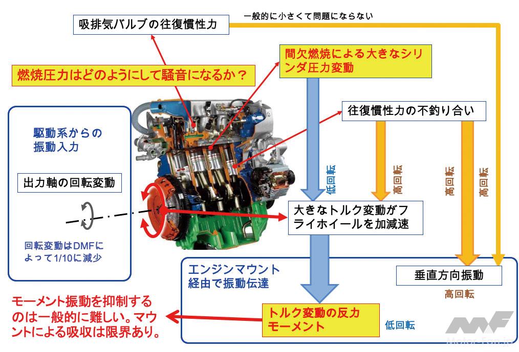 いっぽうレシプロエンジンの振動は、下の図に示すように、ピストン・コンロッドの往復慣性力による加振力と間欠燃焼によるトルク変動が原因となる、2種類の振動が発生する。前者はエンジン回転数の自乗に比例して大きくなるのに対して、後者はシリンダー圧力、すなわちエンジン負荷に略比例して大きくなる。結果、高回転では前者の振動、低回転高負荷では後者の振動が支配的になる。
