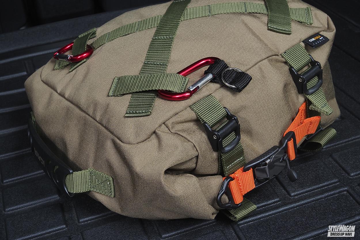 今回紹介するジムニーにも様々なアイテムが装着されている。注目するのはリアビュー。PLOTのオリジナルブランド、NEO PLOTのRVマルチマウントバーに装着されているのはIGAYA(イガヤ)ブランドのエックスシートバック。10LサイズのMと20LサイズのLがあり、カラーはブラックとカーキベージュの2種類。ロールトップ式でコーデュラ500を使用し、防水インナーを組み合わせる事で内部は完全防水仕様となっている。さらに2種類のベルトが付属し、マルチマウントへの固定、ショルダーバック、バックパックとしての使用など使い方は様々。グリップも装着されており、内部に形状をキープするためのプレートがあるので形崩れせずに使う事が可能だ。ロールトップのサイドに装着されているFIDLOCKバックルはストラップを引くと一瞬で外れ、装着はマグネットで簡単。それでいて引く力に対してはかなり強い。マルチマウントバーにはLサイズが2つ装着可能。四駆ならではのレスキューツールを入れておくのもアリ。アウトドアでの車内に積みたくない汚れ物や濡れたウェアなどを入れておくのもアリだ。バックパック用のベルトを使用して、スペアタイヤへの取り付けも可能。このIGAYAのエックスシートバックはオーナーの工夫次第で様々な使い方ができる多機能防水バックなのだ。