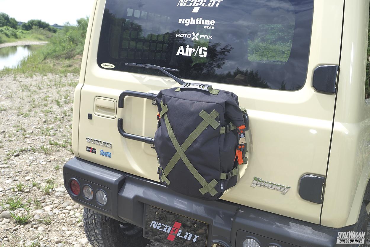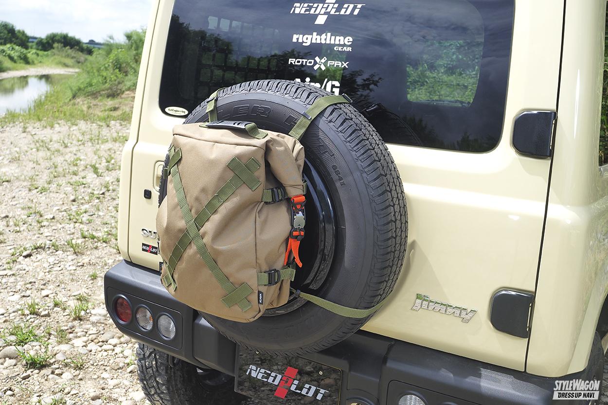ジムニーのリアビューにはNEOPLOTのRVマルチマウントバーを装備することでエックスシートバックが装着可能。MとLを用途に合わせて、さまざまな取り付け方ができる。バックパックのベルトを利用して、スペアタイヤにも付けられる。