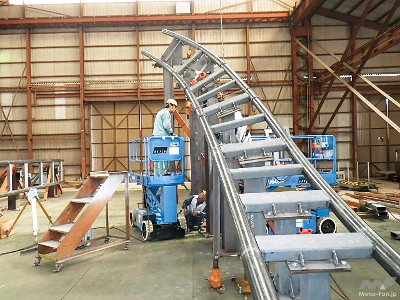 だから、直線と単純なRの組み合わせから、クロソイド曲線(緩和曲線)を利用したコース設計に移行した。これなら、急激な加速度の変化は起こらない。最近はクロソイド曲線も主流ではなく、コンピューターで設計する。ベースはNoLimitsというローラーコースター(今さらだが、ジェットコースターは和製英語で、欧米ではローラーコースターと呼ぶ)のシミュレーションソフトだ。好き勝手にコースを設定すれば、一定Rではない滑らかな曲線をソフトが描いてくれる。三精テクノロジーズでは制作会社からコードを購入し、設計精度を高めるなどのカスタマイズを施して使っているという。世界中のコースターデザイナーが(いるのだ!)このソフトを使っているのだそう。