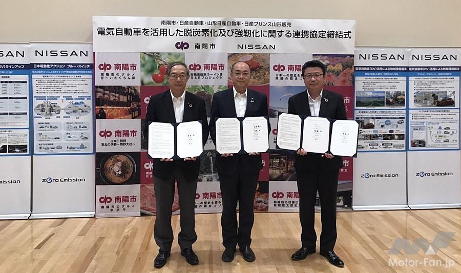 本協定は、「走る蓄電池」となる電気自動車(EV)の普及や脱炭素化の推進と同時に、南陽市で災害による停電が発生した際、日産の販売会社から貸与する電気自動車(EV)「日産リーフ」等を電力源とした災害時の電力供給体制の構築を目的とした協定で、ゼロ・エミッション社会の実現を目指す日産の『ブルー・スイッチ』活動としては191件目の取り組みとなる。