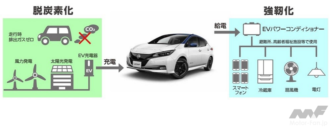 一方、日産自動車は、EVならではの新たな価値やワクワクを提供し続けるとともに、2018年5月より、EVの普及を通じて、脱炭素、災害対策、エネルギーマネジメント、観光、地方での交通課題などの地域課題解決を目指す、日本電動化アクション『ブルー・スイッチ』を、全国の自治体や企業、販売会社と共に推進させている。また、2030年代早期には、主要市場で投入する新型車すべてを電動車両にすることを宣言、電動化をリードしながら、SDGsの達成やカーボンニュートラルの実現に向けた取り組みを加速している。
