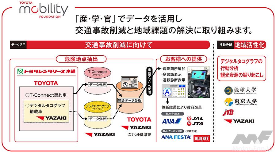 新たにトヨタ自動車も参画し、コネクティッドサービス「T-Connect」を活用したレンタカーの特性分析を行い、事故が起こる可能性が高いと推定される箇所を抽出する。さらに、沖縄県警にデータの検証・確認の協力を得た事故多発箇所も加えて矢崎総業の車載アプリに取り込み、レンタカーのドライバーに注意を促す事で、さらなる事故の未然防止を図る。