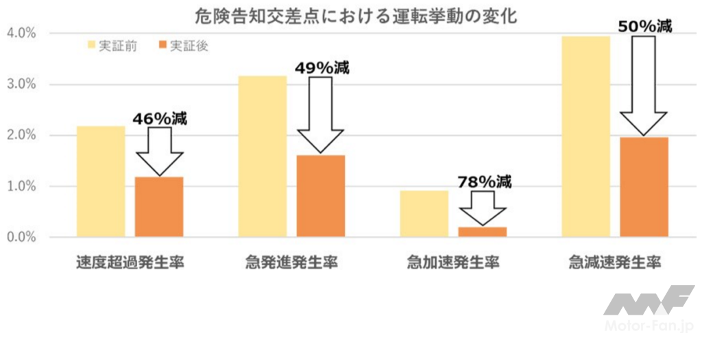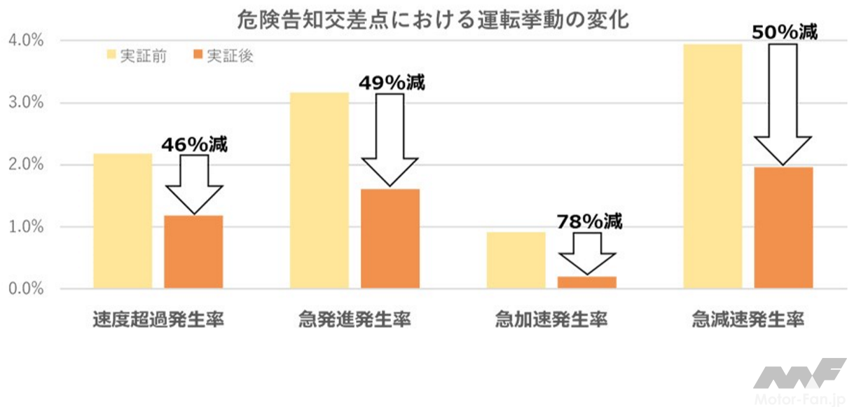 • 危険度が高い8箇所の交差点においては、接近時に警告を行い、実証前と比較して速度超過46%、急発進49%、急加速78%、急減速50%の発生頻度の減少が確認された。(下表)