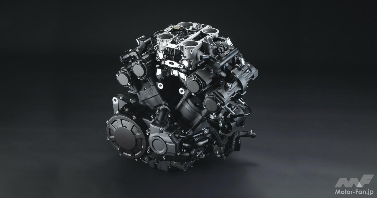 二輪の場合、スポーツ性・操縦性を追求すると、前輪荷重を増す方向、つまりはショートホイールベース化してスイングアームを伸ばしたい。そうなると、エンジンが前後に長く、吸排気レイアウトに難のあるV型は断然不利なのだ。VMAXは先代からVバンク角を70度から65度に縮めた。エンジンの排気量がアップして大型になった分、何としてもエンジン長さを詰めたかったからだ。しかしあまり角度を詰めると、独立スロットルを持つバイクでは、吸気系のレイアウトがキツくなる。後バンクの排気管の処理も難しい。走行性能、操縦性を徹底的に追求するスーパースポーツを効率的に作るなら直列が圧倒的に有利。それは同じヤマハのMotoGPエンジンを見ればわかる。