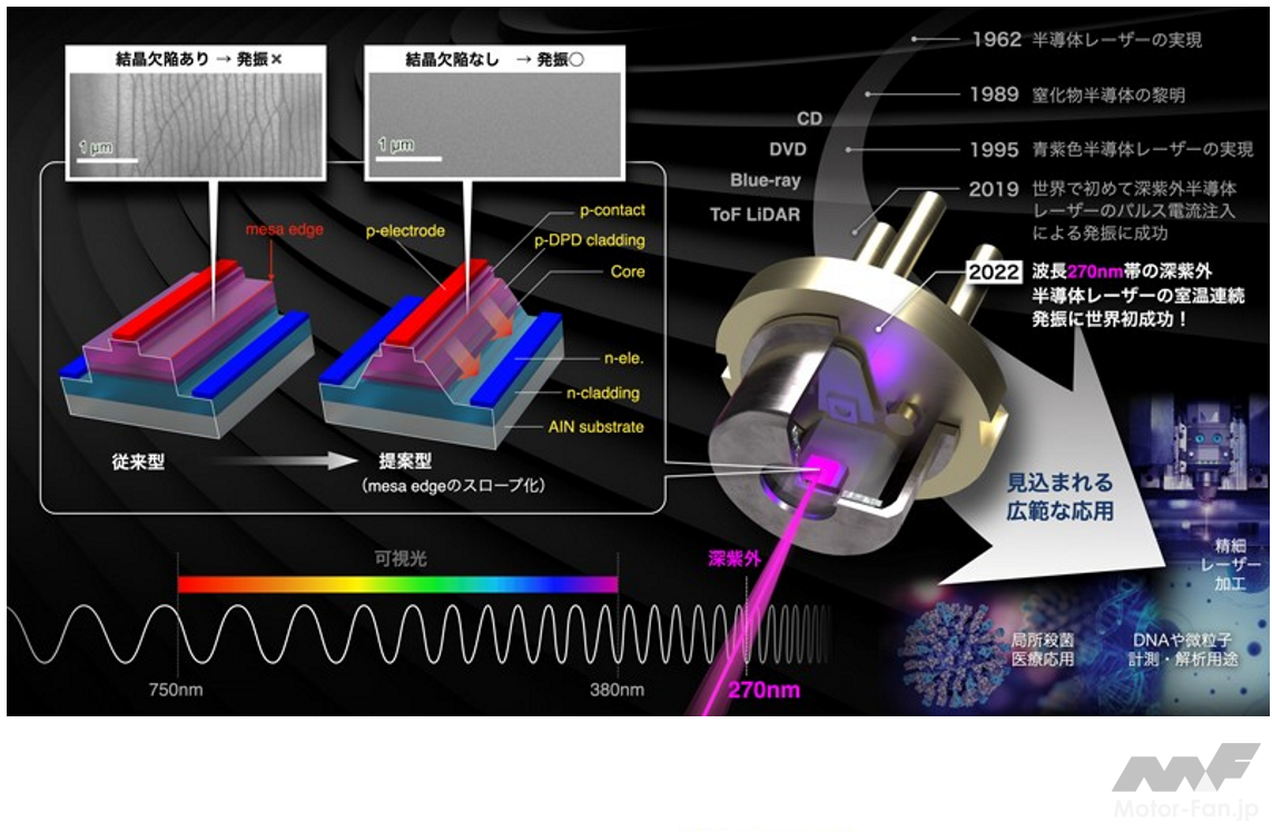 本共同研究グループは、UV-C LD素子を形成する結晶の乱れがレーザー特性を劣化させることを見出し、全く結晶の乱れが発生しない素子の作製に成功した。これにより、レーザー発振に必要な駆動電力を従来の1/10までに低減させ、電池駆動も可能な室温連続発振を実現した。UV-C LDの特長を生かし、医療や殺菌などヘルスケア用途、ウイルス検知や微粒子などの計測やガス分析用途、さらには金属や炭素素材、樹脂素材など微細加工が難しい材料への高精細なレーザー加工用途への応用が期待されている。