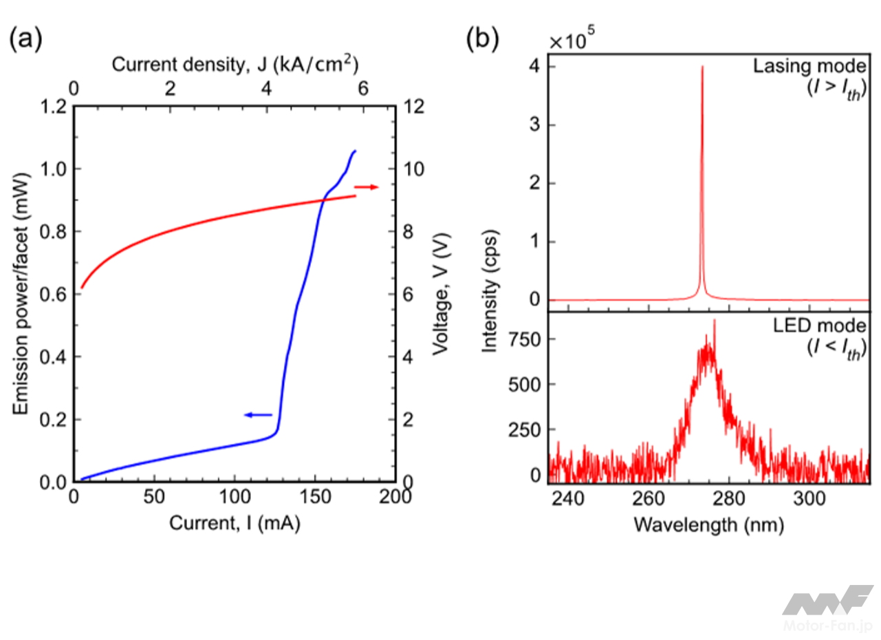名古屋大学未来材料・システム研究所 天野浩教授らの研究グループは、旭化成と共同で、世界で初めてUV-C帯域注2)274nmの深紫外半導体レーザー(UV-C LD)の室温連続発振に成功した。UV-C LDは殺菌や医療を始め幅広い応用が期待される光源で、本共同研究グループは2019年、世界に先駆けてUV-C LDの室温パルス発振に成功している。今回その技術がさらに進化され、より実用性のある直流電源によるレーザー発振に成功した。