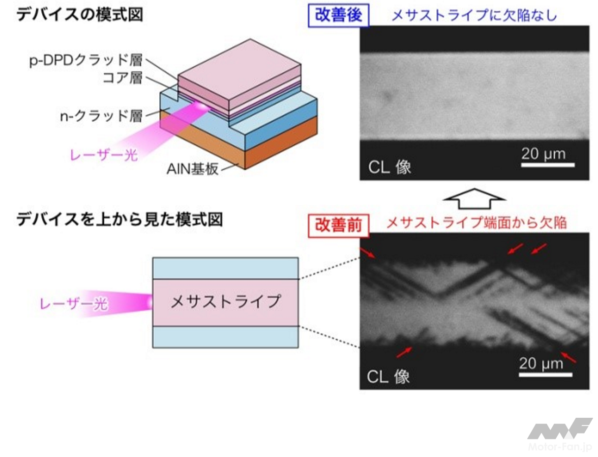 本共同研究グループは、従来のUV-C LDのメサストライプ注4)の端に発生する結晶の乱れ、すなわち結晶欠陥に着目した。メサストライプ端の結晶欠陥は共振器内部に延伸することで閾値(しきいち)電流密度注5)を悪化させるだけでなく、電極設計に制限を与えることで駆動電圧を悪化させる。種々の試作、解析およびモデリングを用いた多角的なアプローチによる検討の結果、結晶欠陥の発生の原因がメサストライプにかかる応力の局所集中であることが見出されている。そこで、応力を制御するためメサストライプの構造を、従来の垂直型から傾斜型へと刷新し、結晶欠陥の抑制に成功した(図1)。さらに、光学設計の改良と薄膜結晶成長条件の改善も同時に行われ、閾値電流密度を4.2 kA/cm2、また閾値電圧を8.7 Vと世界最高水準まで大幅に改善された(図2)。これにより、レーザー発振に必要な駆動電力を従来の1/10に低減することが可能になった。