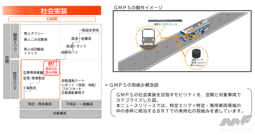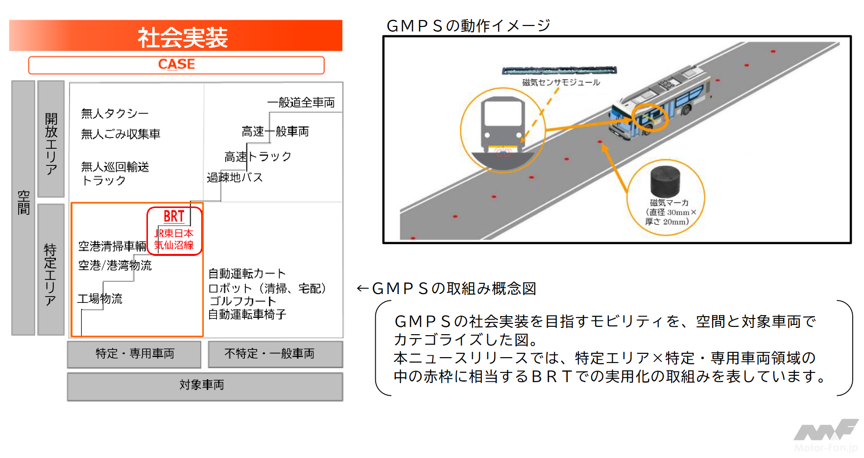 実証実験においてGMPSは、正確性を求められる車線維持や正着制御をはじめ、GNSS電波の届かないトンネルなどの場面で、高精度かつ安定的な性能を実証してきた。この成果を受け、GMPSは「安全性に直結する高精度な自車位置推定」を担うシステムとして自動運転バスに導入された。自動運転実用化区間4.8kmの全区間に磁気マーカが埋め込まれ、自車位置推定で安全・安心な自動運転を支援する。