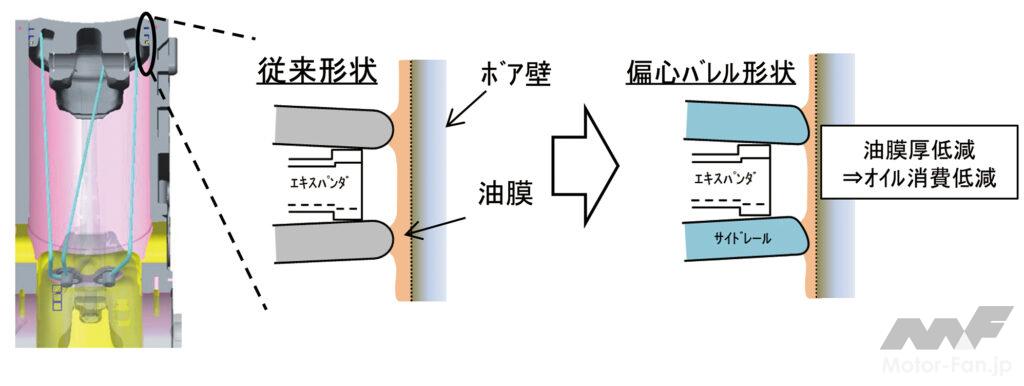 ここまではすべてヘッドの改良だが、“腰下”を見ても、高出力・高効率化のための技術が数多く採用されている。M20A型エンジンは、リッター当たり出力が64.5kW(87.7ps)に達する高出力エンジンだが、限られたボア径(≒吸気ポート径)で高出力を出すには、回転数を高めるしかない。その阻害要因がピストンスピードなのだが、それに対応するための技術のひとつが、偏心バレル型のピストンリングだ。