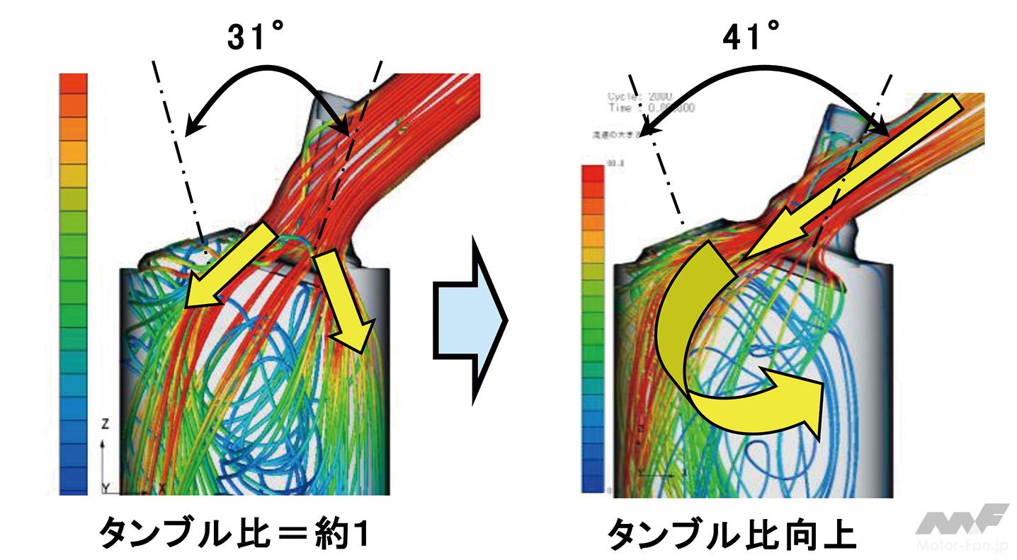 その高速燃焼に必要なのが、高い吸気流速によるタンブル流の強化だ。