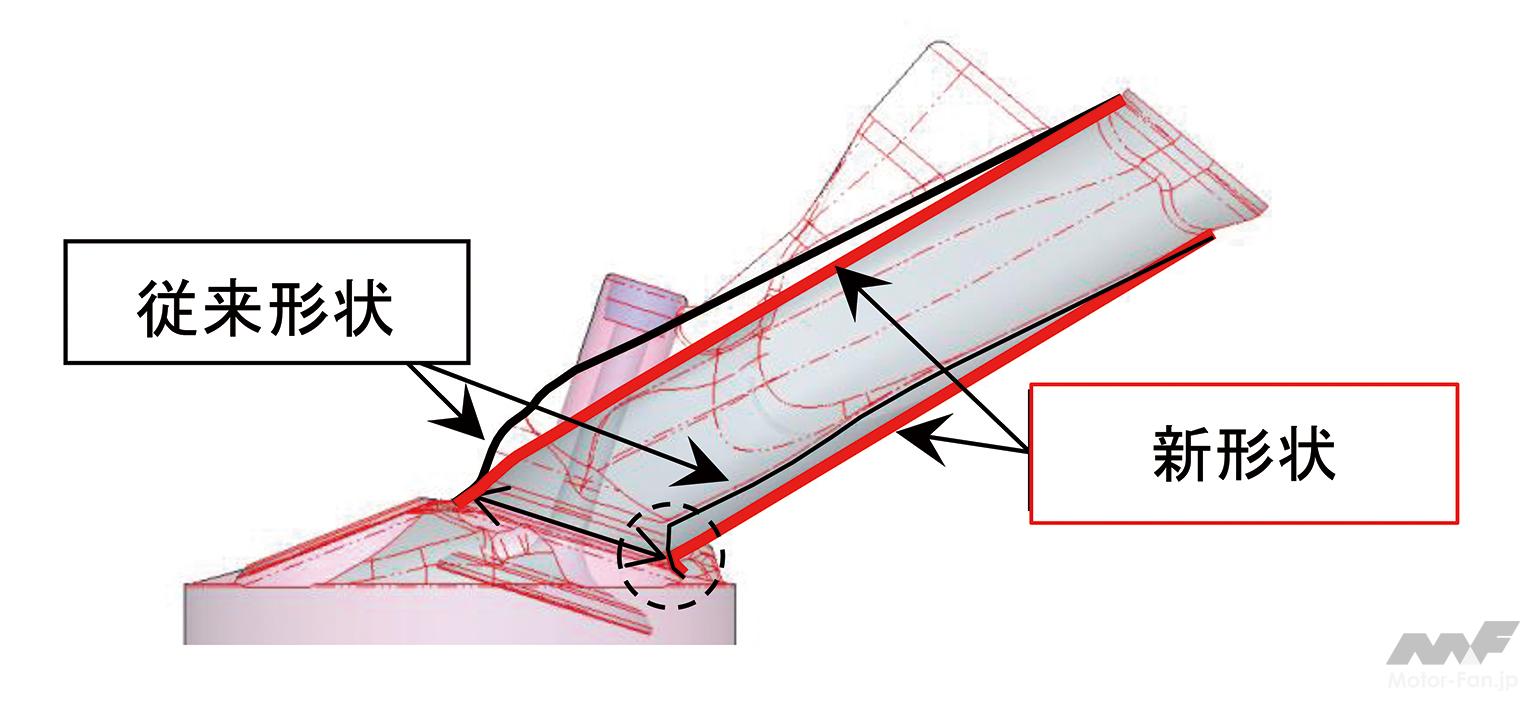 ロングストローク化によってボア径が小さくなると、バルブ面積が取りにくくなり、タンブル流を強めるために吸気流を偏らせれば、有効に使えるポート面積も狭くなる。そこでバルブ挟み角を拡大し、ヘッド側の面積を大きくしてバルブ面積を確保。タンブル比と流量係数の両立を図った。