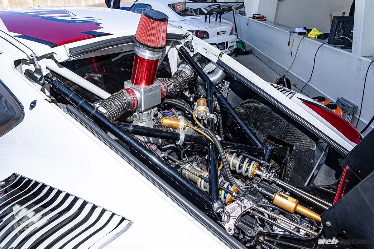 室内空間を残してリヤ周りはバッサリとカットしてパイプフレーム化。サスペンション形式はダブルウィッシュボーンだが、レーシングカーさながらのインボード式へと大改造している。ちなみに製作イメージはル・マンを走った911GT1とのこと。