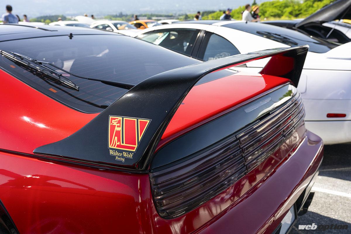 エアロパーツはフロントバンパーがターボ用の純正で、フロントにドゥーラック、リヤにJスピードのオーバーフェンダー、リヤディフューザーはデイトナ、ウイングはインパルというミックス構成。ウイングやフェンダーのウォルター・ウルフステッカーは、ワンオフで製作した。