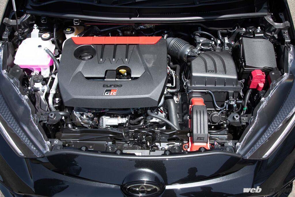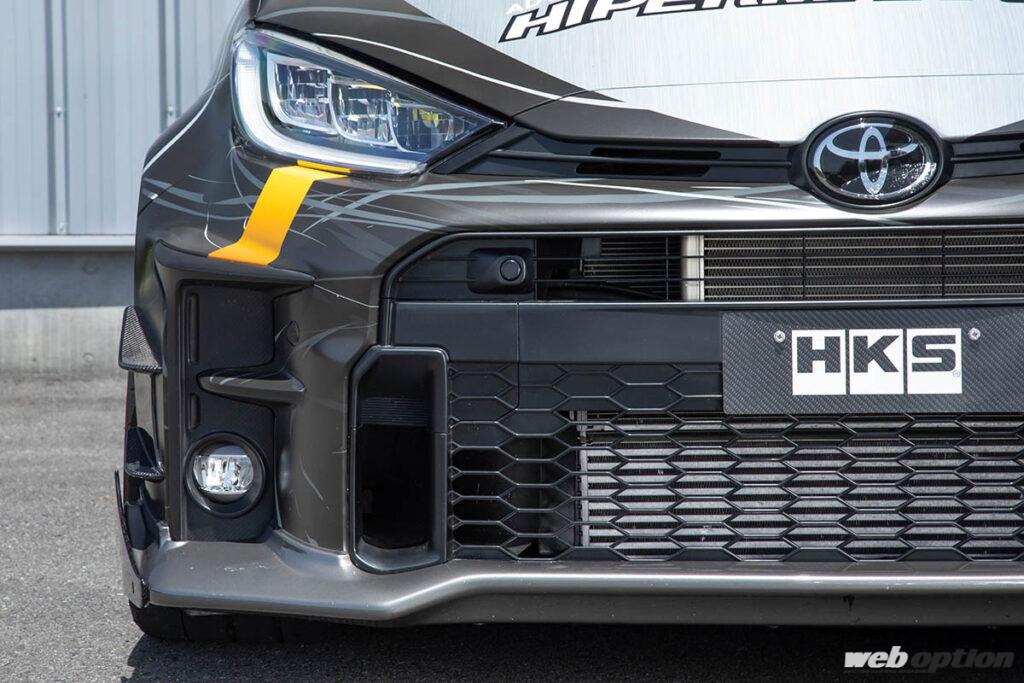 進化型GRヤリスに搭載されるG16Eエンジンは、これまでのシリーズ最強だったGRカローラ用と比較して304psの最大パワーは同じだが、トルクは37.7kgmから40.8kgmへとさらに高められている。エンジンルームに収まる様子は大きな変化はないようだが、電装系や補機類を見る限り、恐らくGRカローラ用をベースにしているというのがHKSの見解。エアクリーナーボックスの容量や吸気パイプ、エアフロなど吸気系は変わっていないようだ。