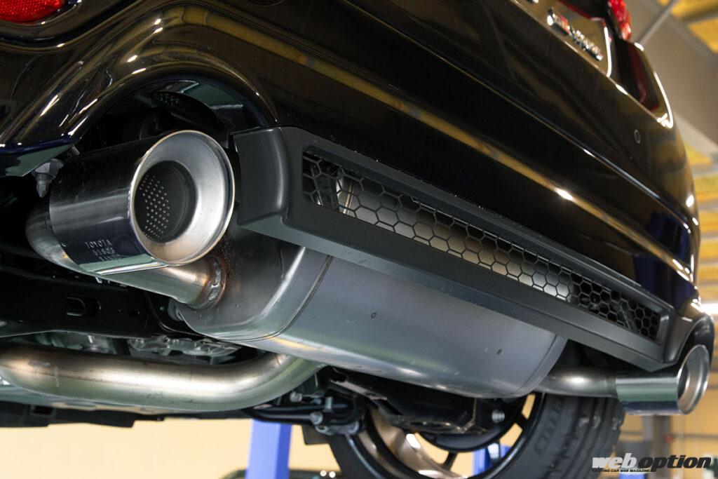 また、バンパー内のメインサイレンサーも丸形断面から多角形断面となり、容量が拡大されている。これは、消音性能を高めるための変更というのがHKSの見解。今回の検証では触媒がどうなっているかは確認できなかったが、性能に関わるマフラーのパイプ径やレイアウトには大きな変更は無さそうだ。