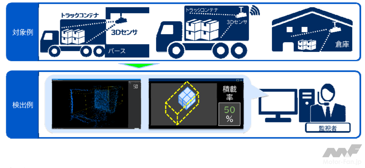 NEC通信システムは、モビリティや産業DXを通じたソリューション事業を推進する中で、3Dセンサを活用した「NEC3次元積載量可視化ソフトウェア」の開発に挑戦し実現した。両社の持つ技術やサービスを連携させることで、まずは、物流(貨物)の積載状況の実態を可視化、把握することから開始し、最終的には効率化を実現するためのシステムやサービスの構築を考えている。