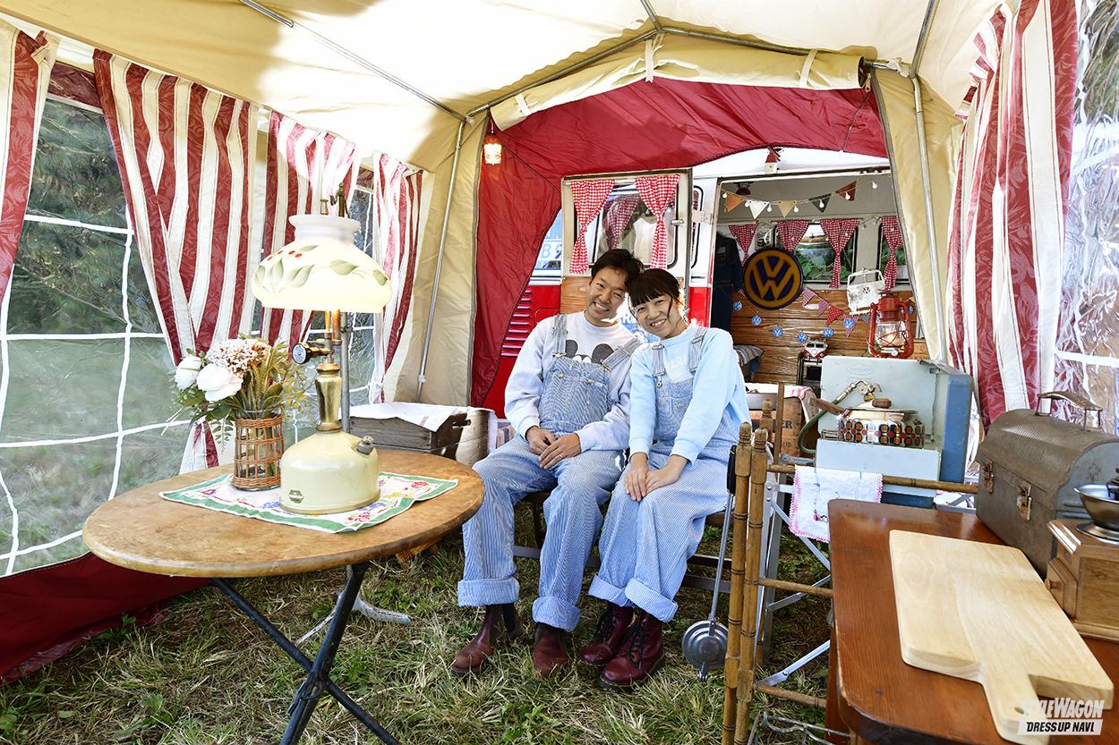 レトロで可愛らしい雰囲気が漂う夫婦のキャンプベースは、いつも注目の的。「お店みたいですね」と声をかけられることもしばしばだとか。お洒落キャンパーが集う昨今のキャンプ場でも、ひときわユニークな2人と1台といえるだろう。