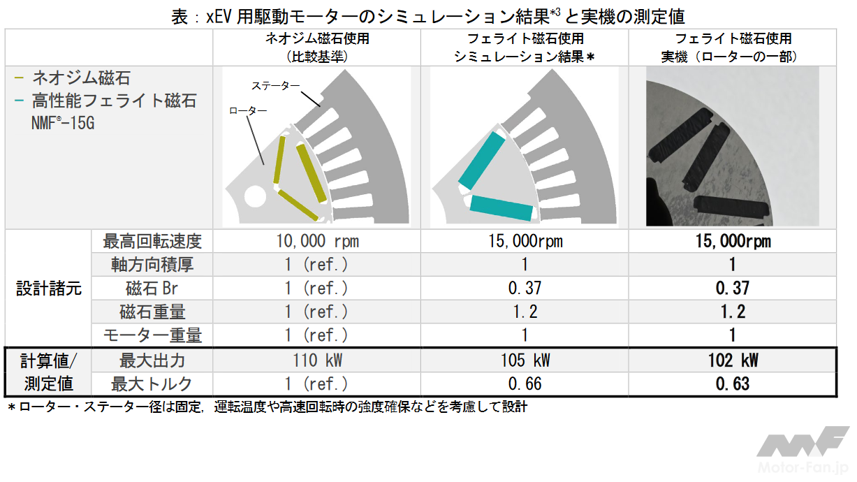 プロテリアルでは、この度当社高性能フェライト磁石(NMF-15)を用いたモーターを試作して性能評価が行われた。このモーターは、xEV駆動用のネオジム磁石モーターを比較基準としたシミュレーション結果(表参照)に基づいて設計・製作したローター(写真)を適用したものである。性能試験を実施したところ、シミュレーション結果よりわずかに劣るものの、これから主流になっていくことが予想されるBEVやPHEVの駆動モーターに適用可能な、100kWを超える出力が得られることが確認された。