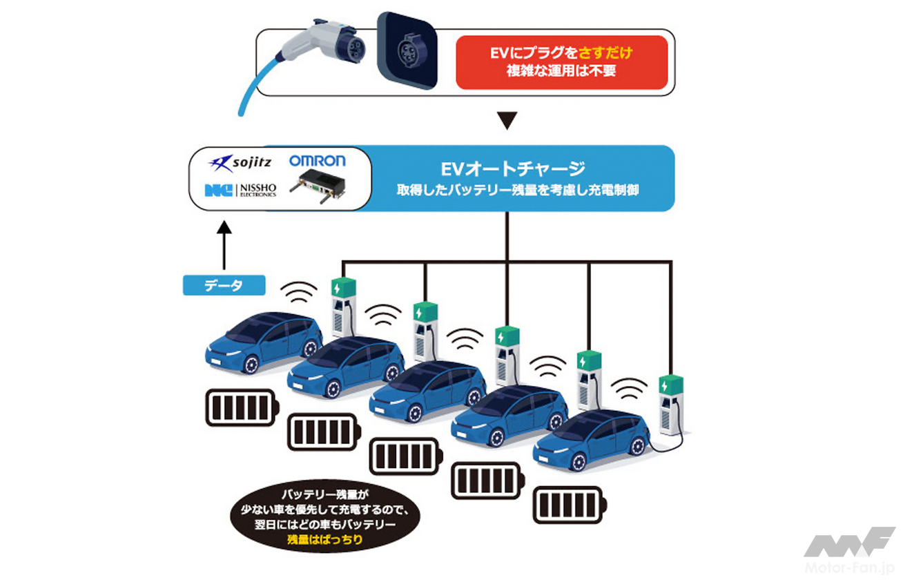 双日・日商エレ・OSSの三社は、このような商用EV・PHEV普及の課題に対して、施設内の電力需要を把握した上で、車両の残充電量を常時把握し翌日始業時刻などの適切なタイミングに分散して充電することで、施設の購入電力を上限目標値以下に抑制する「EVオートチャージ」を2022年11月より提供しており、積水ハウス向け第1弾案件として豊橋支店への納入・設置を完了した。一般的なサービスでは、充電計画の入力などが日々発生するのに対して、本サービスは充電残量を自動で取得するため、EVにプラグを挿すだけで最適な充電ができ、複雑な運用なく利用することができる。