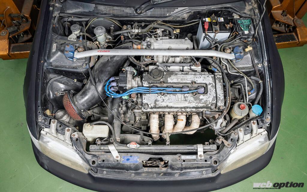 吸排気チューンが施されているであろうB16エンジン。サンデーレースで使っていた個体のため、抵抗になるエアコンコンプレッサーは潔く撤去されていた。デスビキャップの劣化やパッキンからのオイル滲みなど、怪しいポイントは多い。