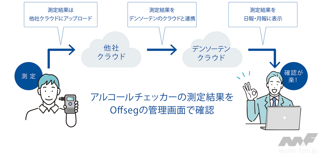 ドライバーがアルコールチェックを行なうと、測定結果がアルコール検知システムを提供する各社のクラウドへアップロードされる。その後デンソーテンのクラウドと連携し、Offsegの日報・月報に測定結果を表示する。安全運転管理者は、Offsegの管理画面上で乗務員ごとの運行記録とアルコール検知結果を同時に確認できるため、手間を省くことができる。