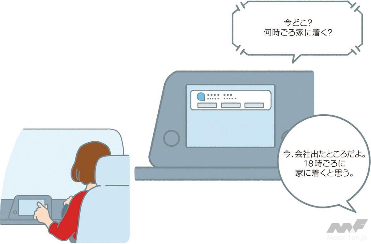 これらの特長により、お客さまは運転中でもタイムリーにスマートフォン上のメッセージ受信に気づくことができると共に、スマートフォンを操作することなく、音声操作によって安全にメッセージ内容を確認、返信することができるまた、位置情報共有とナビの目的地設定を円滑に行えることで、ご家族・ご友人等との待ち合わせのシーンなどにも活躍する。