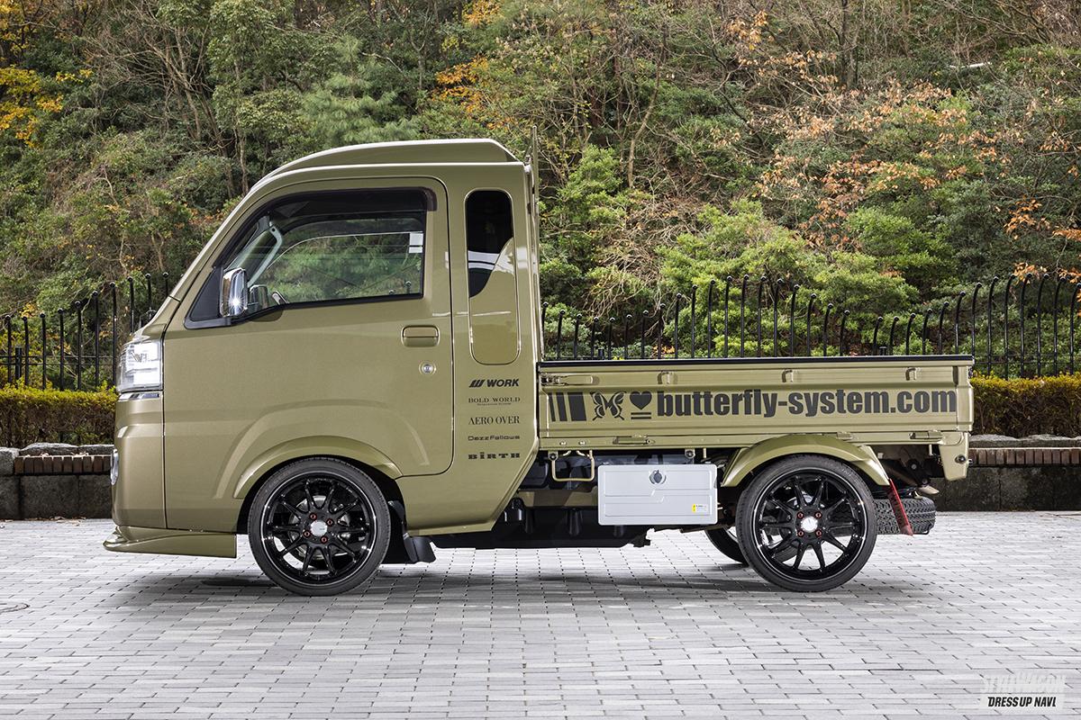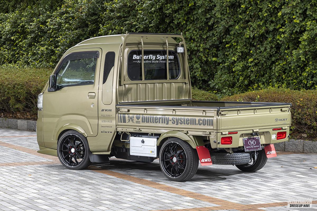 Kカーカスタムの雄、バタフライシステムも初のKトラパーツをリリース。ベースは圧倒的人気を誇るハイゼットのジャンボ。DIYでも取り付けができるグランツフラップシリーズからの登場で、パーツ構成は3点のみとシンプル。Kトラカスタムは顔周りに集中しがちなため前後バランスが難しいが、サイズ感と存在感を絶妙にバランスさせた“ちょうど良い”シルエットに仕立てられている。注目はジャンボならではのサイドガラスをカバーするサイドウィンドゥカバー。他にはなく、かつお手軽! これは買いですよ。後期用も開発中!