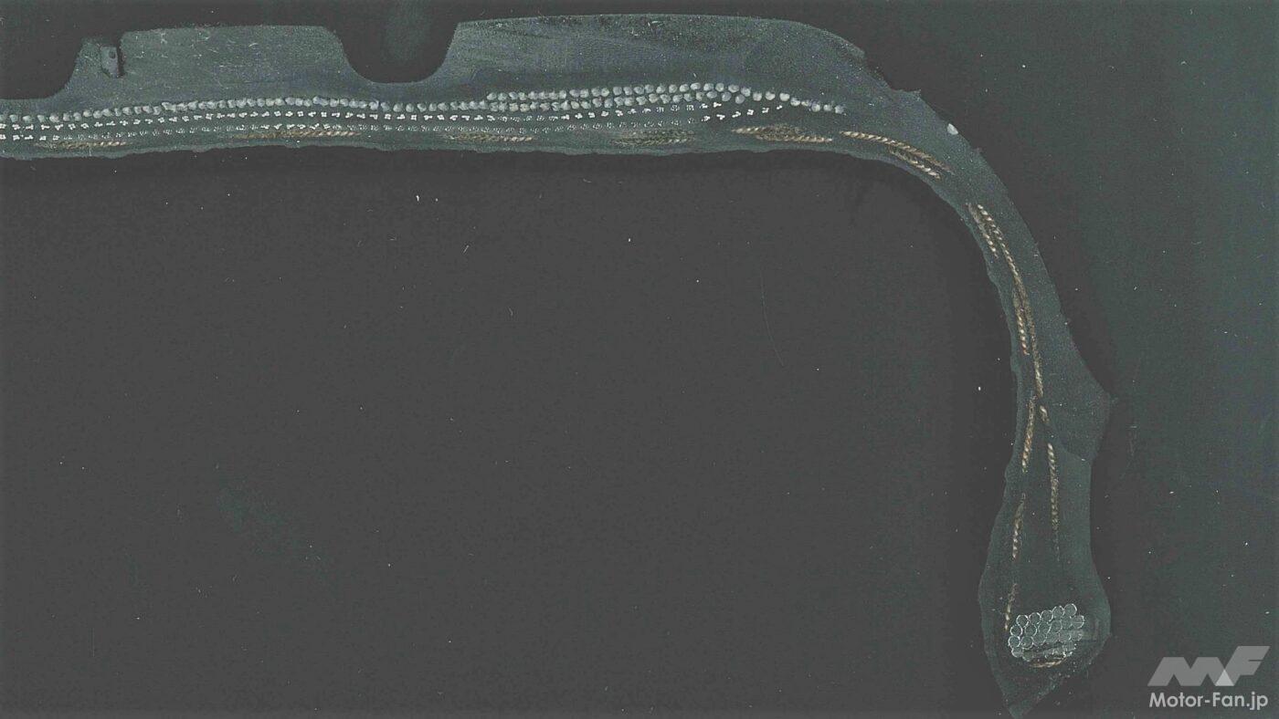 「角度の付いたカーカスをトレッド面の端まで折り返して重ねるマトリックス・ボディ・プライは、“タガ効果”で剛性を稼ぐのですが、剛性が出る、イコール剪断力が掛かるということです。当然耐久性にも影響するので、例えばレーヨンの糸を含浸させるコンパウンドの特性をチューニングするなどのケアもセットで必要になります。地味なところでは、斜めに角度がついたレーヨンを切断する際の処理についても、量産性と品質の両立を踏まえながら工夫している点です」(堀内氏)