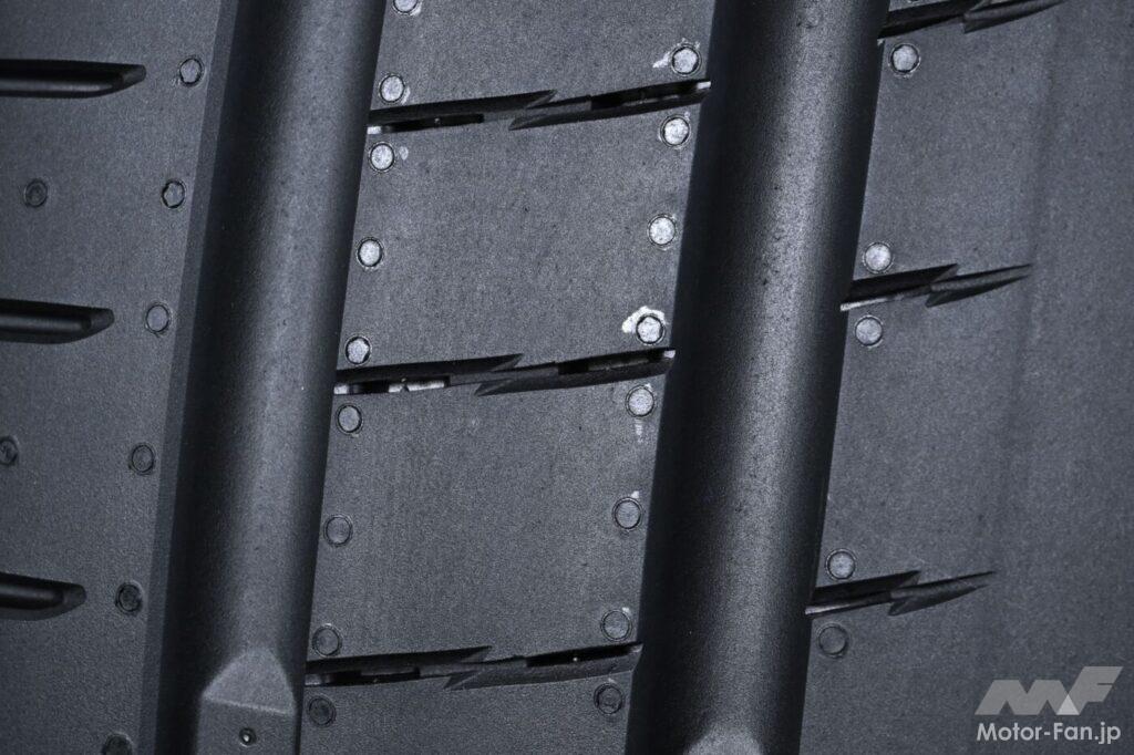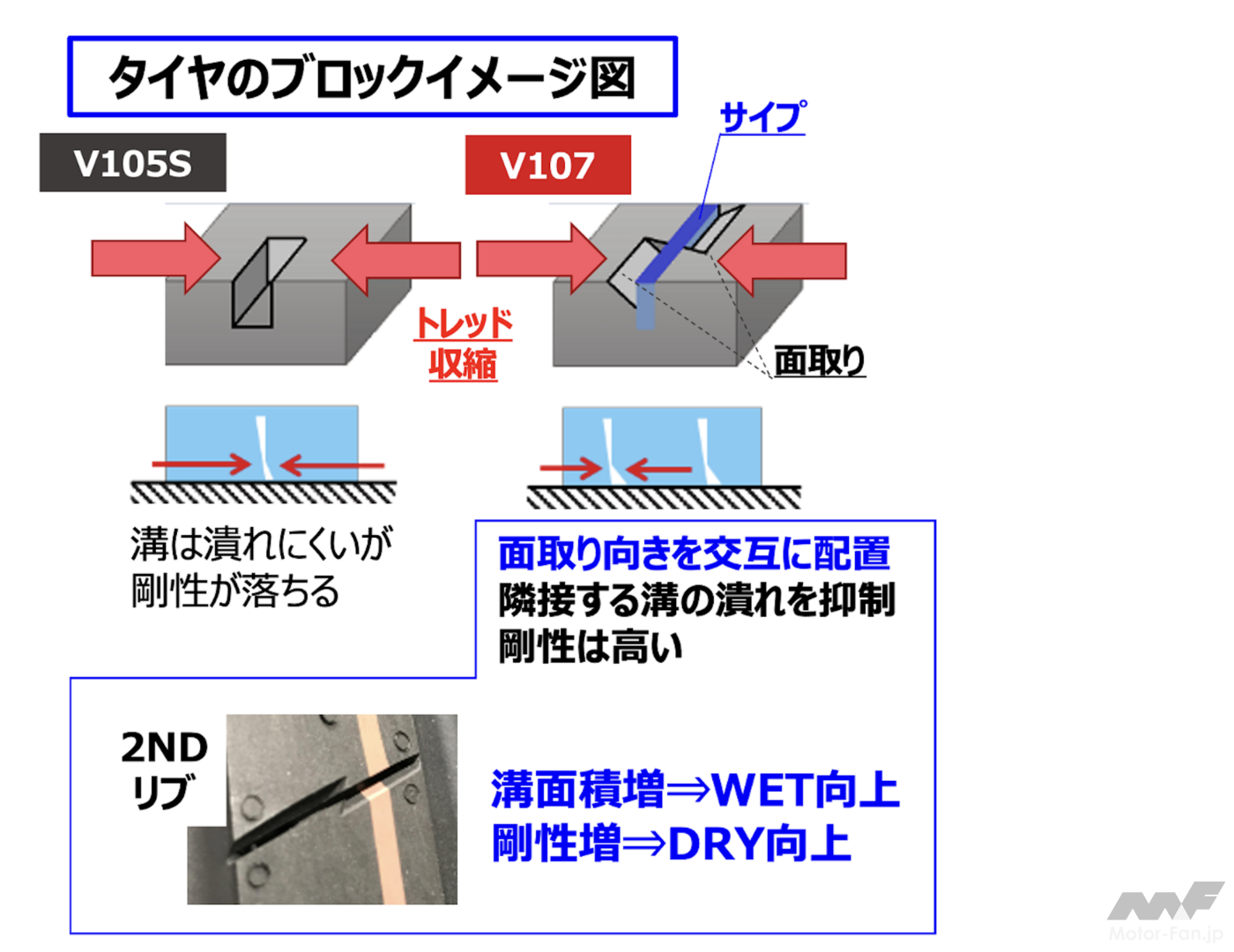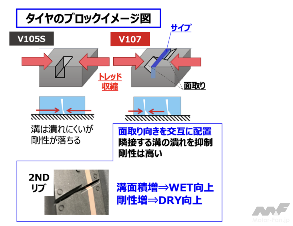 V107のトレッド面の中ほどに刻まれるサイプ。中間地点で面取りの向きが互いに入れ替わっており、どちらの方向の力でも隣接する溝同士で支え合って、潰れを最小限に抑制することで剛性を確保。ドライ性能に貢献するブロック剛性の向上と、ウェット性能の向上に繋がる溝面積拡大を同時に実現。視点を変えればソフトなコンパウンドでも成立が可能になったということでもある。