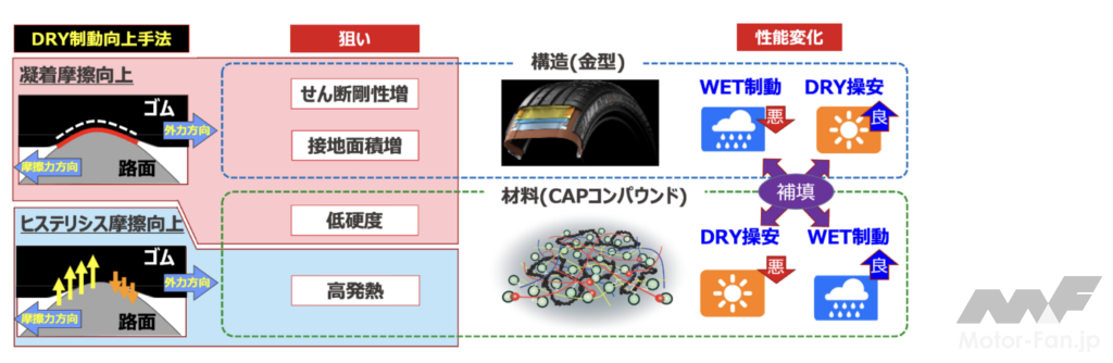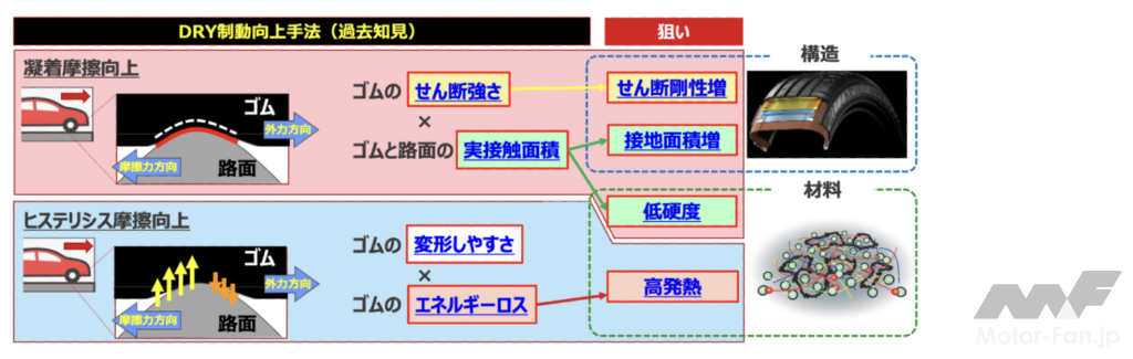 「キーポイントに掲げたドライ制動の性能向上のために着目したのが、凝着摩擦とヒステリシス摩擦でした。凝着摩擦は柔らかいゴムが使われるモータースポーツ系のタイヤがイメージしやすいですが、路面に接着するような作用で生まれます。もうひとつのヒステリシス摩擦はゴムが路面から力を受けて変形する際に生じるエネルギーロスに伴って生じるものです」(植村氏)