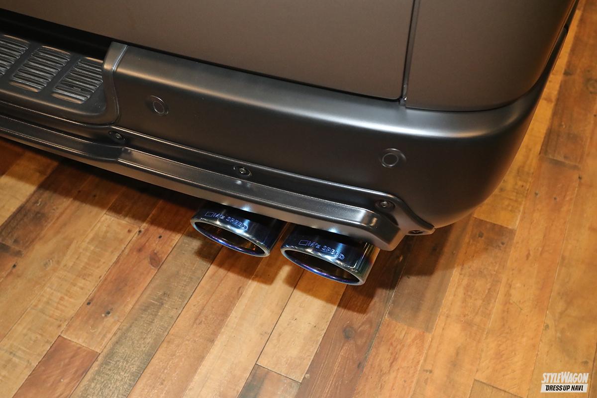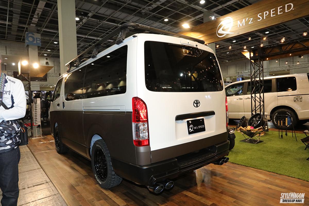 バンパーガードをイメージさせるエアロパーツやマッドテレーンタイヤで外遊びが似合う逞しさを引き出しつつ、ウッドパネルをイメージさせるブラウンのラッピングでカジュアルな外遊びスタイルへと200系をブラッシュアップしたエムズスピード。オフはもちろん、オンにも使えるオシャレな1台だ。