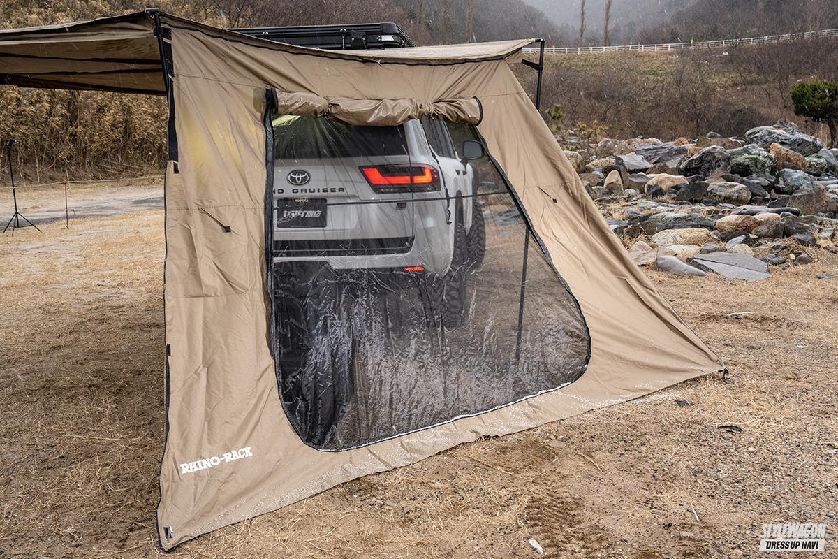 とくにオーナーYOU氏が独自性も加味してアピールするのが、北米ブランド“KC”をフューチャーしたライティングシステム。また、車中泊ならぬ車上泊を実現するルーフトップテントも組み合わせ、車内の積載スペースを犠牲にせずままキモとなる寝床も確保しているんです!!